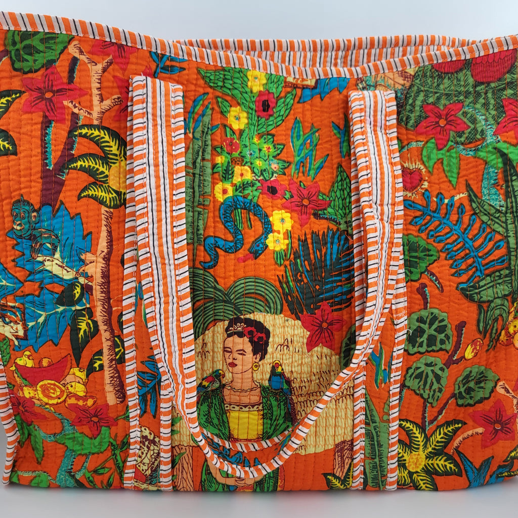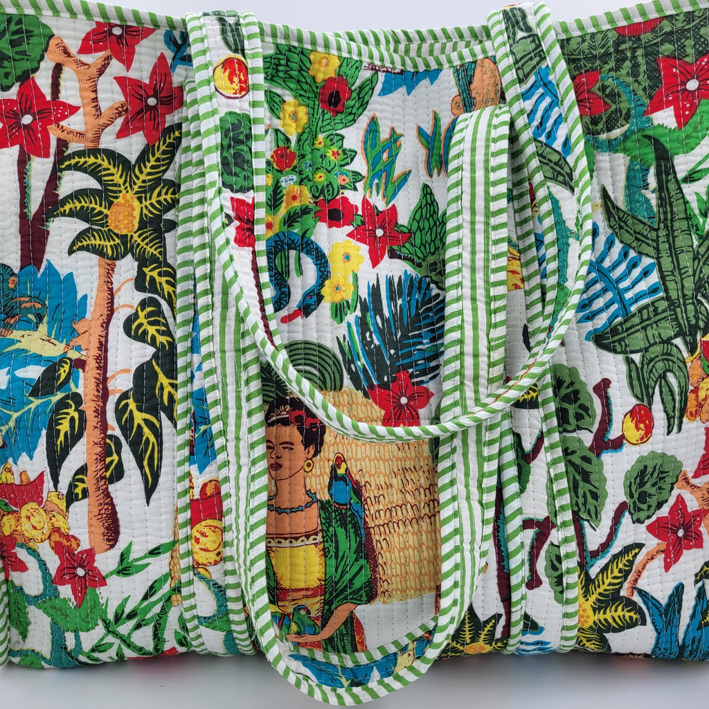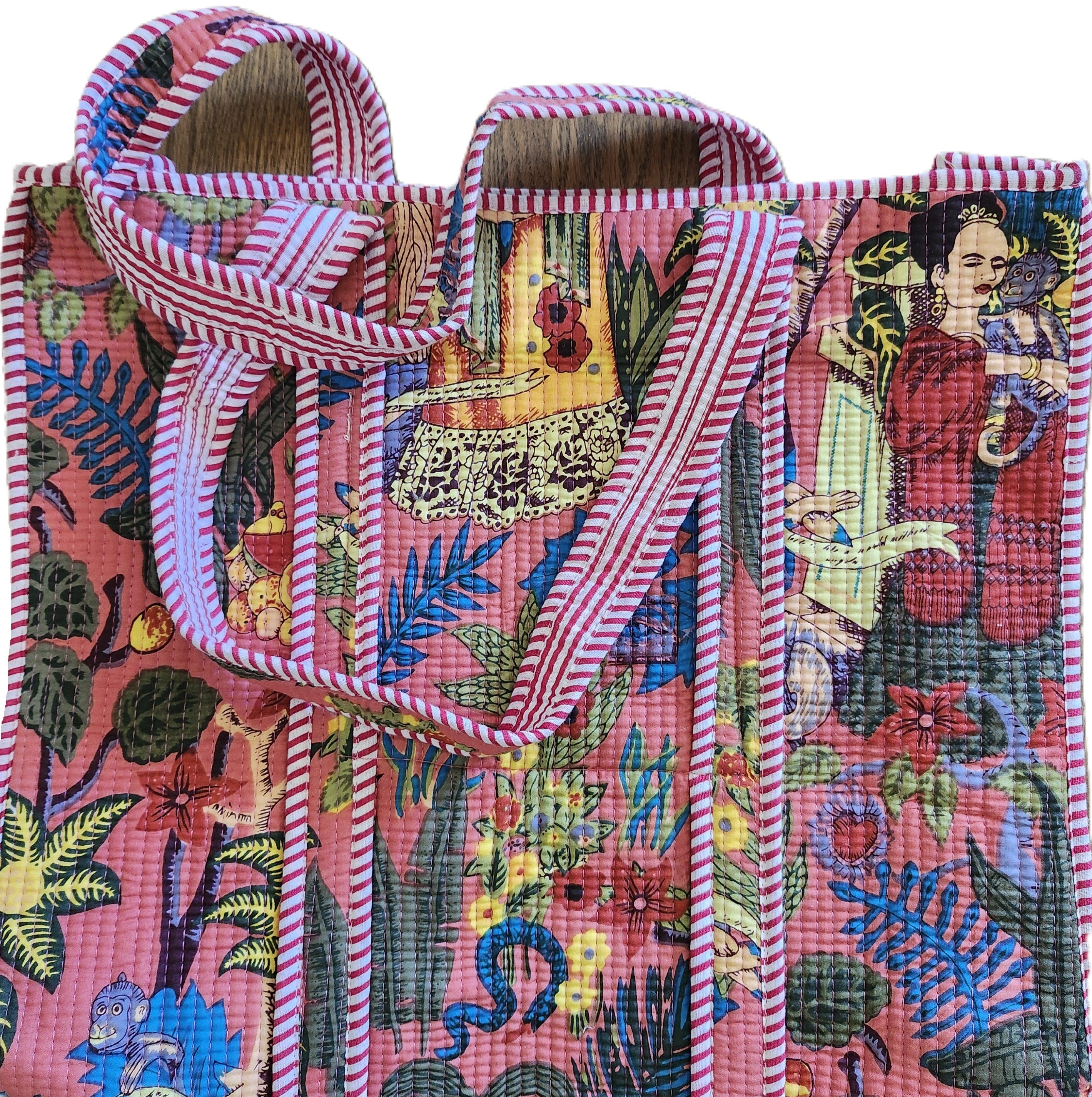 Discover the ultimate blend of style and functionality with our block printed shopper bags in homage to Frida Kahlo, the celebrated Mexican painter. Made in a quilted fabric, each bag has a contrast lining and an interior pocket. Generously sized, it accommodates all your essentials with ease!
