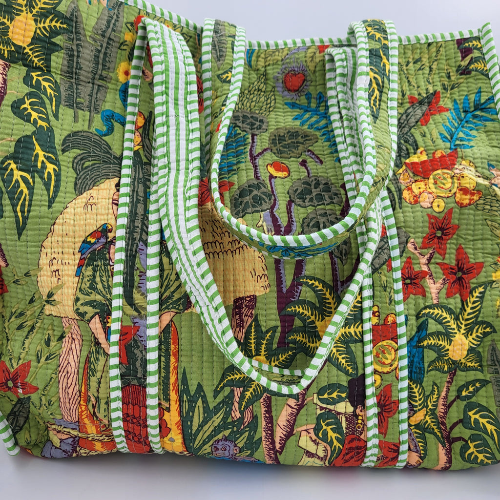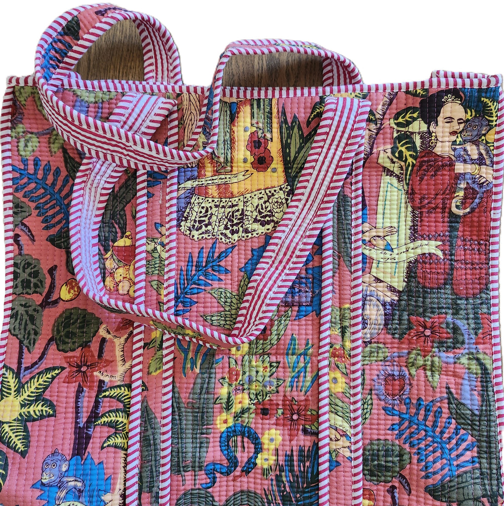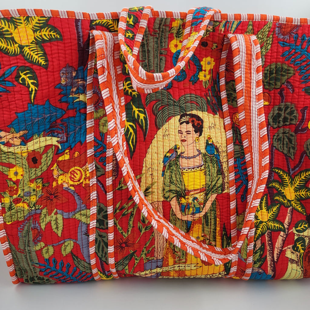 Discover the ultimate blend of style and functionality with our block printed shopper bags in homage to Frida Kahlo, the celebrated Mexican painter. Made in a quilted fabric, each bag has a contrast lining and an interior pocket. Generously sized, it accommodates all your essentials with ease!