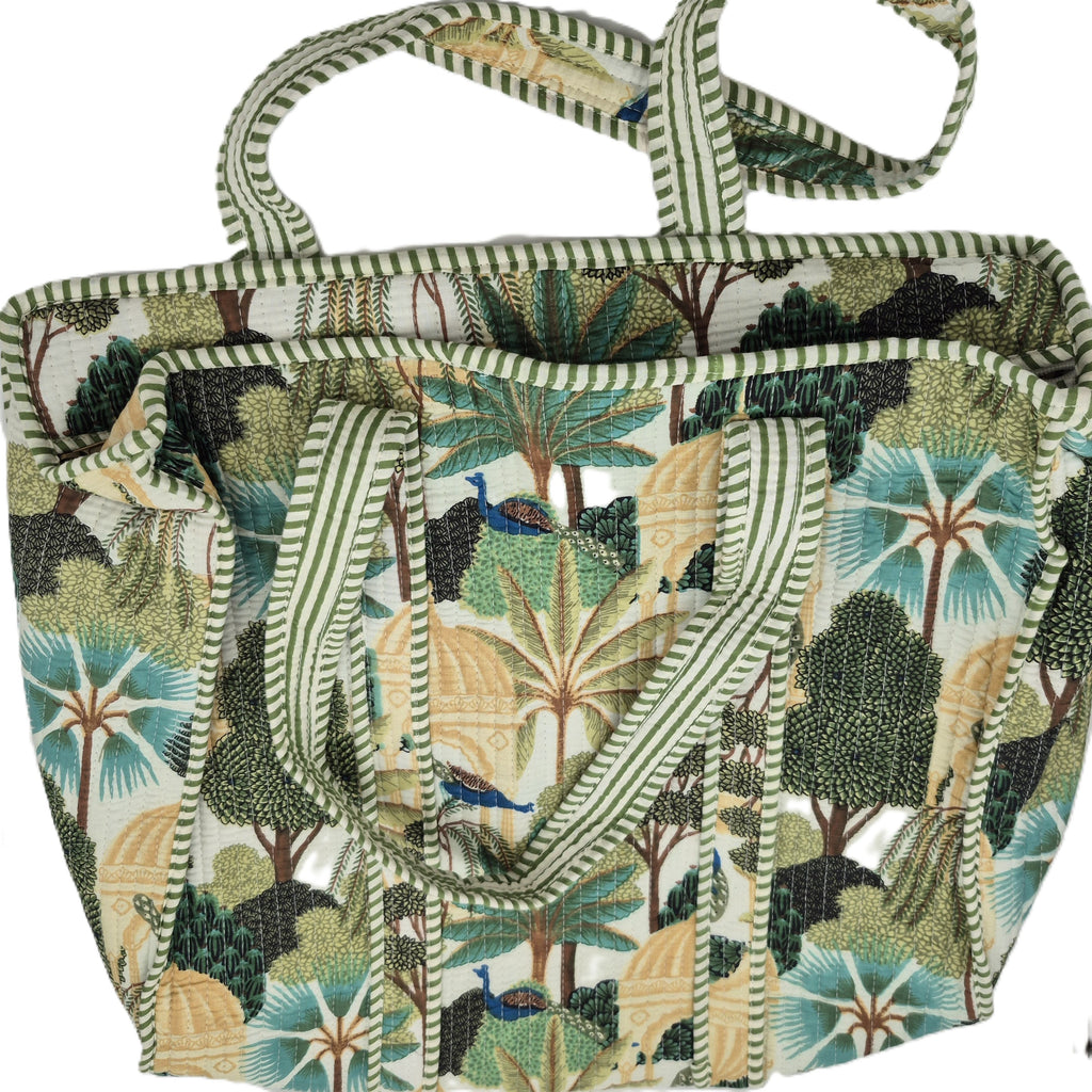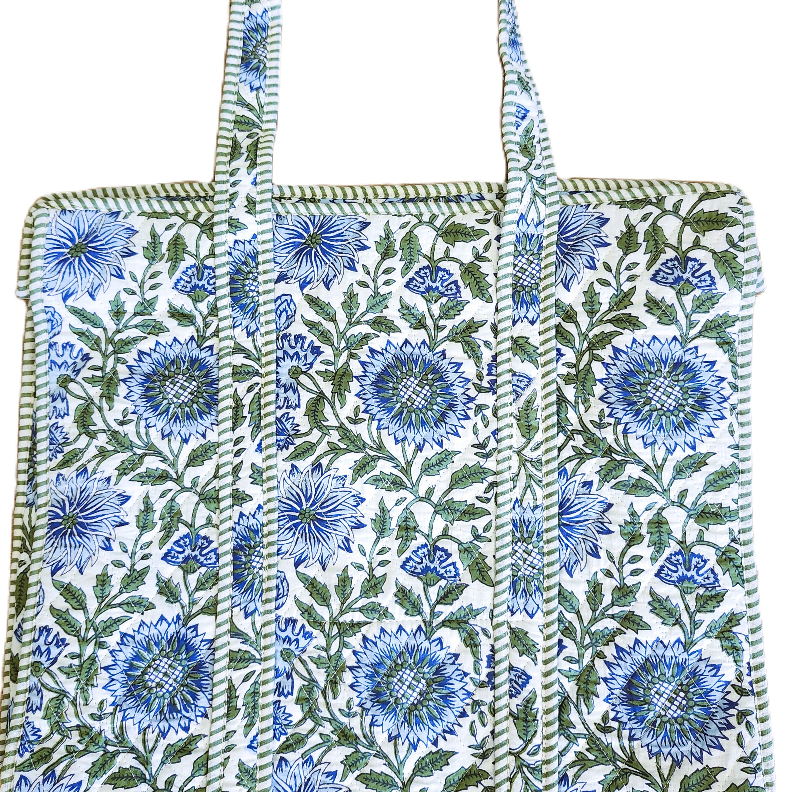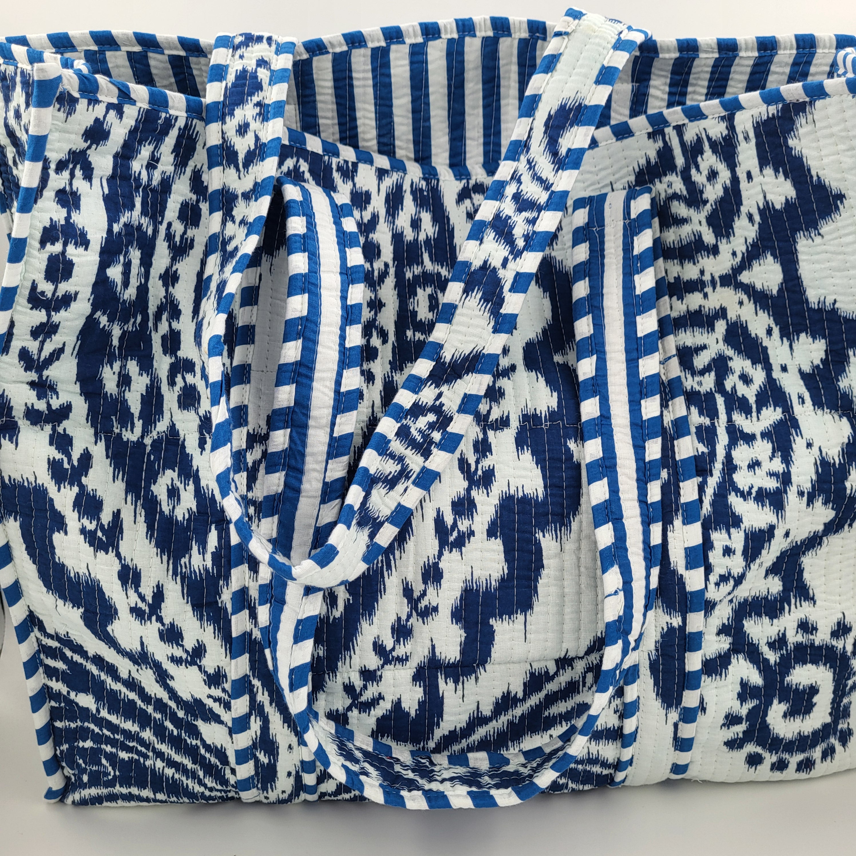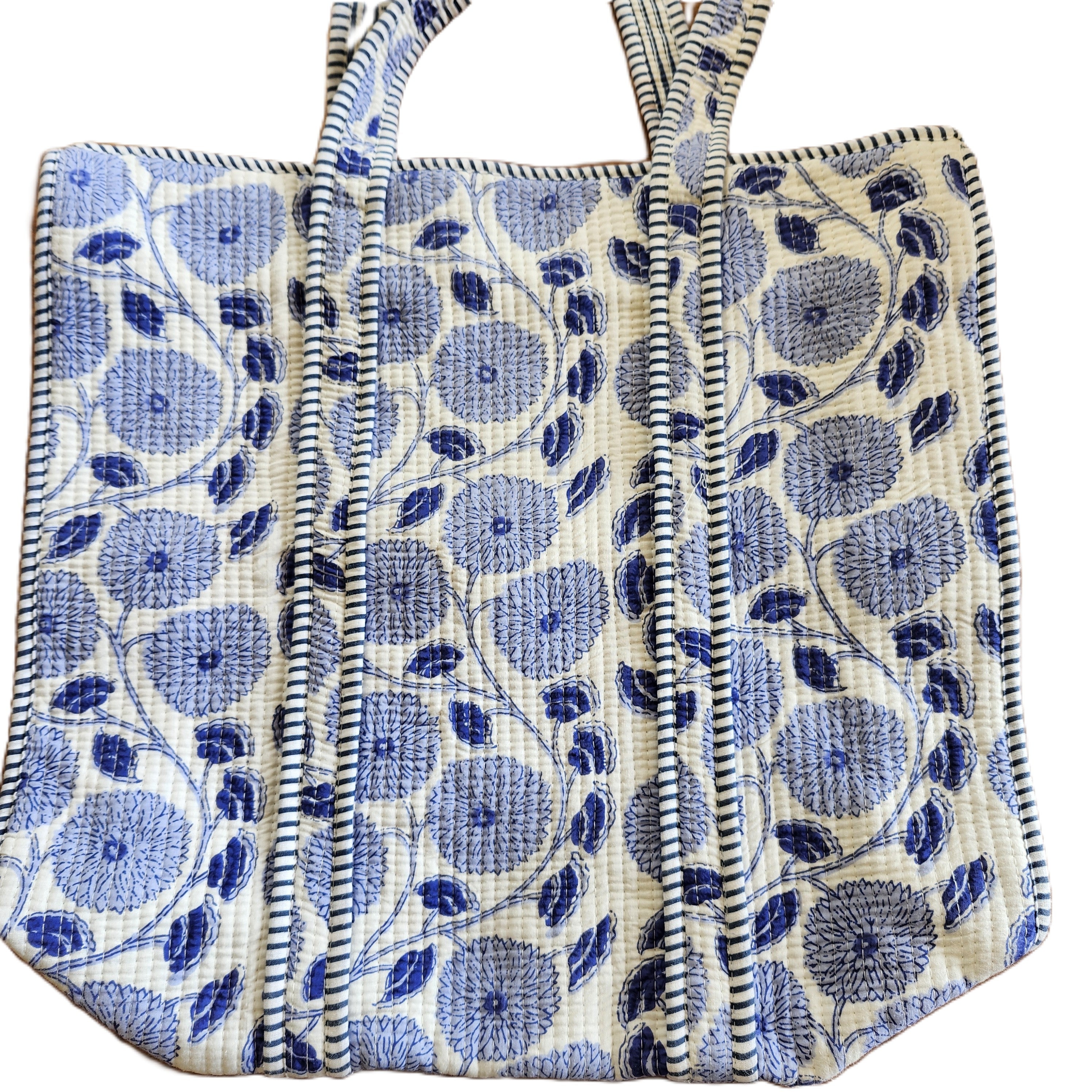 Discover the ultimate blend of style and functionality with our block printed shopper bags in a variety of different designs. Made in a quilted fabric, each bag has a contrast lining and an interior pocket. Generously sized, it accommodates all your essentials with ease!