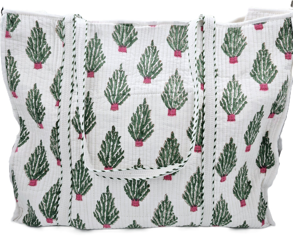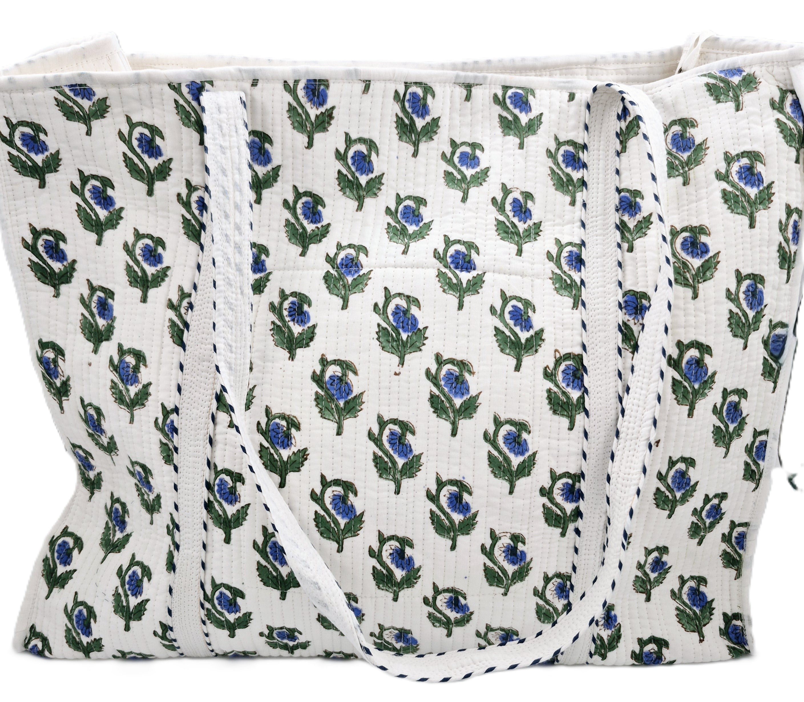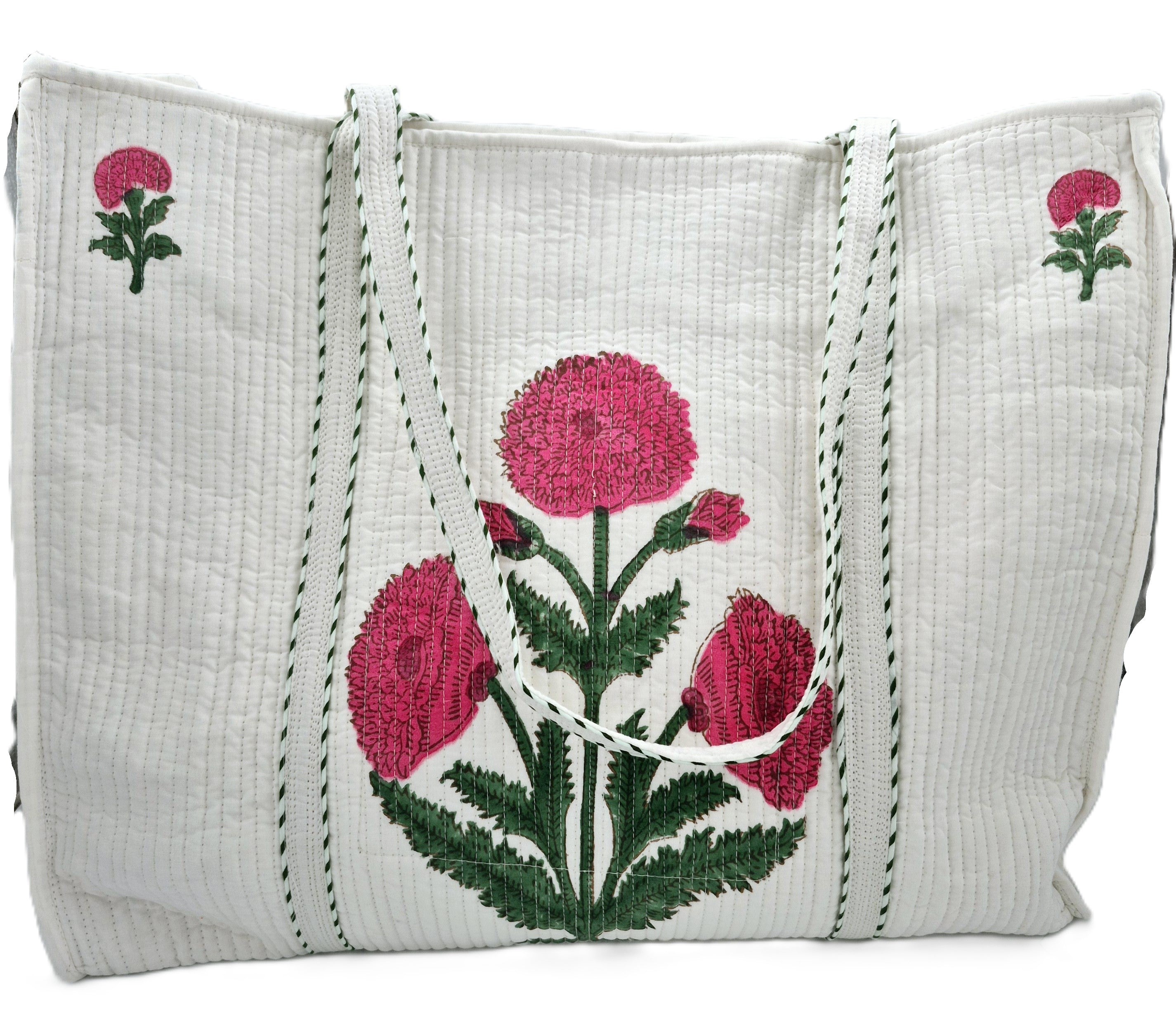 Discover the ultimate blend of style and functionality with our block printed shopper bags in a variety of different designs. The Poppy Plain has a large poppy on one side, and a geometric botanical pattern on the other. Made in a quilted fabric, each bag has a contrast striped lining and two interior pockets. It closes with a zip. Generously sized, it accommodates all your essentials with ease!
