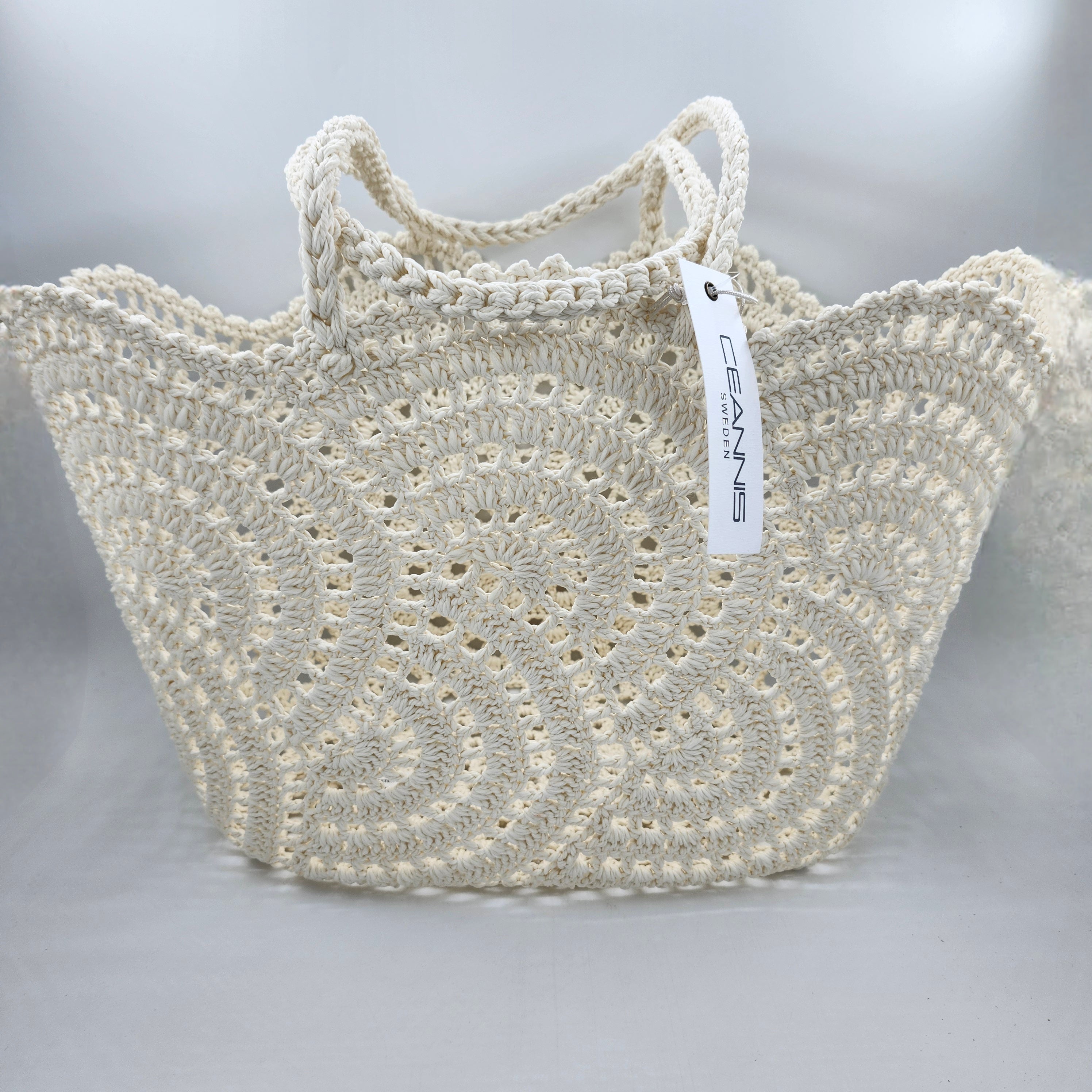 This simple and elegant crochet basket from Ceannis combines style and function. The outer is made from a water resistant woven polyester thread.