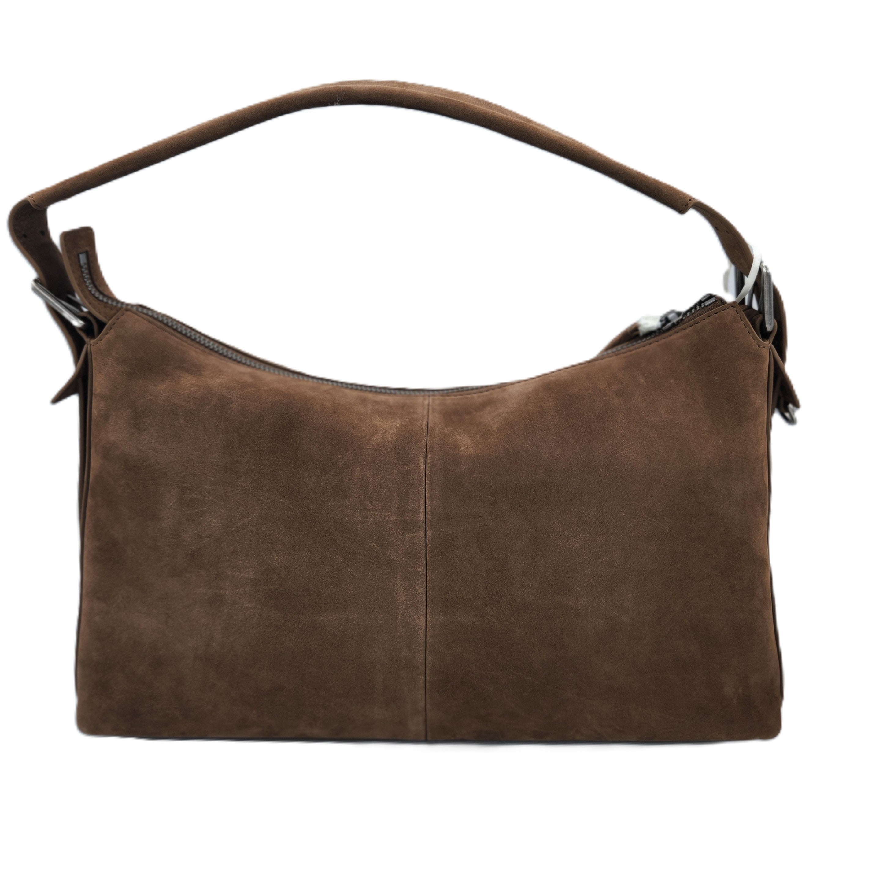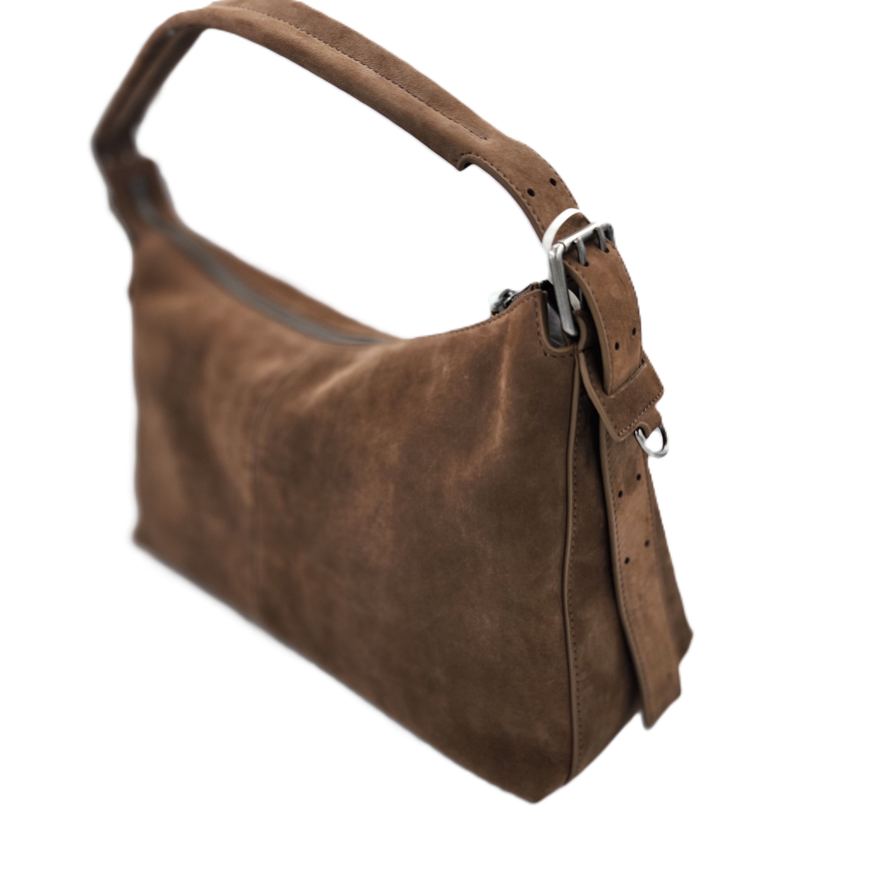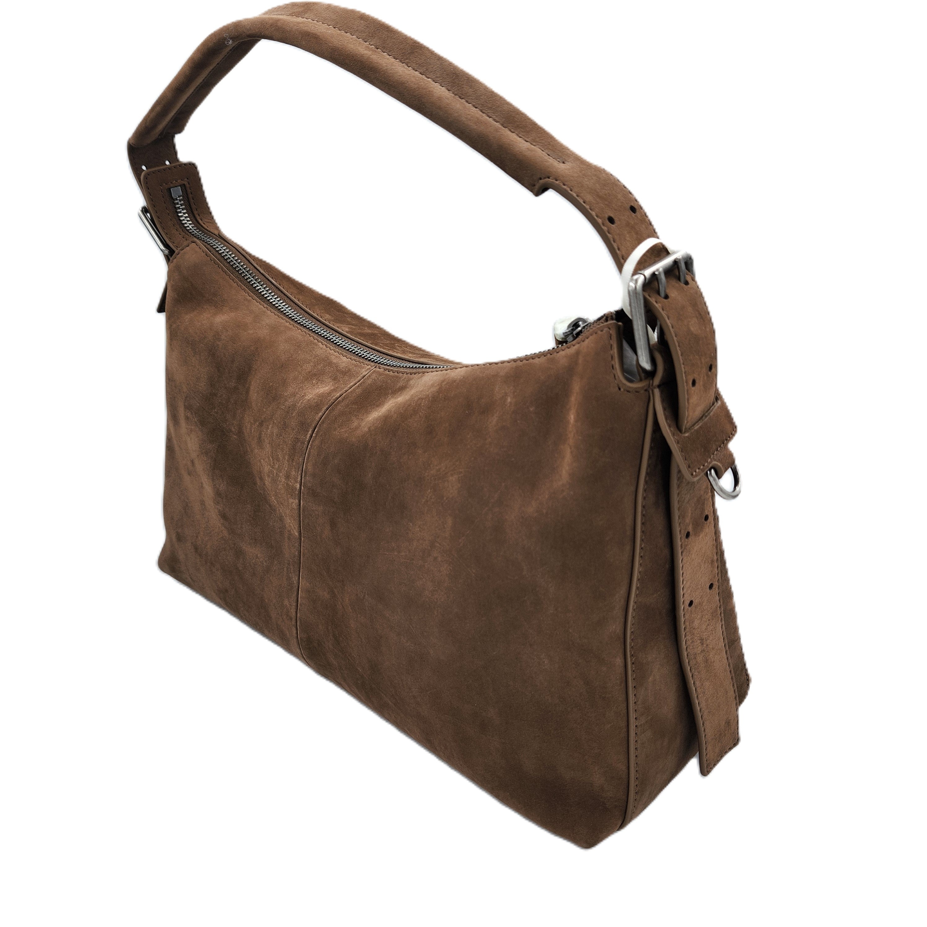 A beautiful soft suede bag in a natural light brown colour. The inside of the bag contains a zipped pocket, with additional pockets on the outside for credit cards, pens and a phone. It closes with a zipper. The leather strap is adjustable.