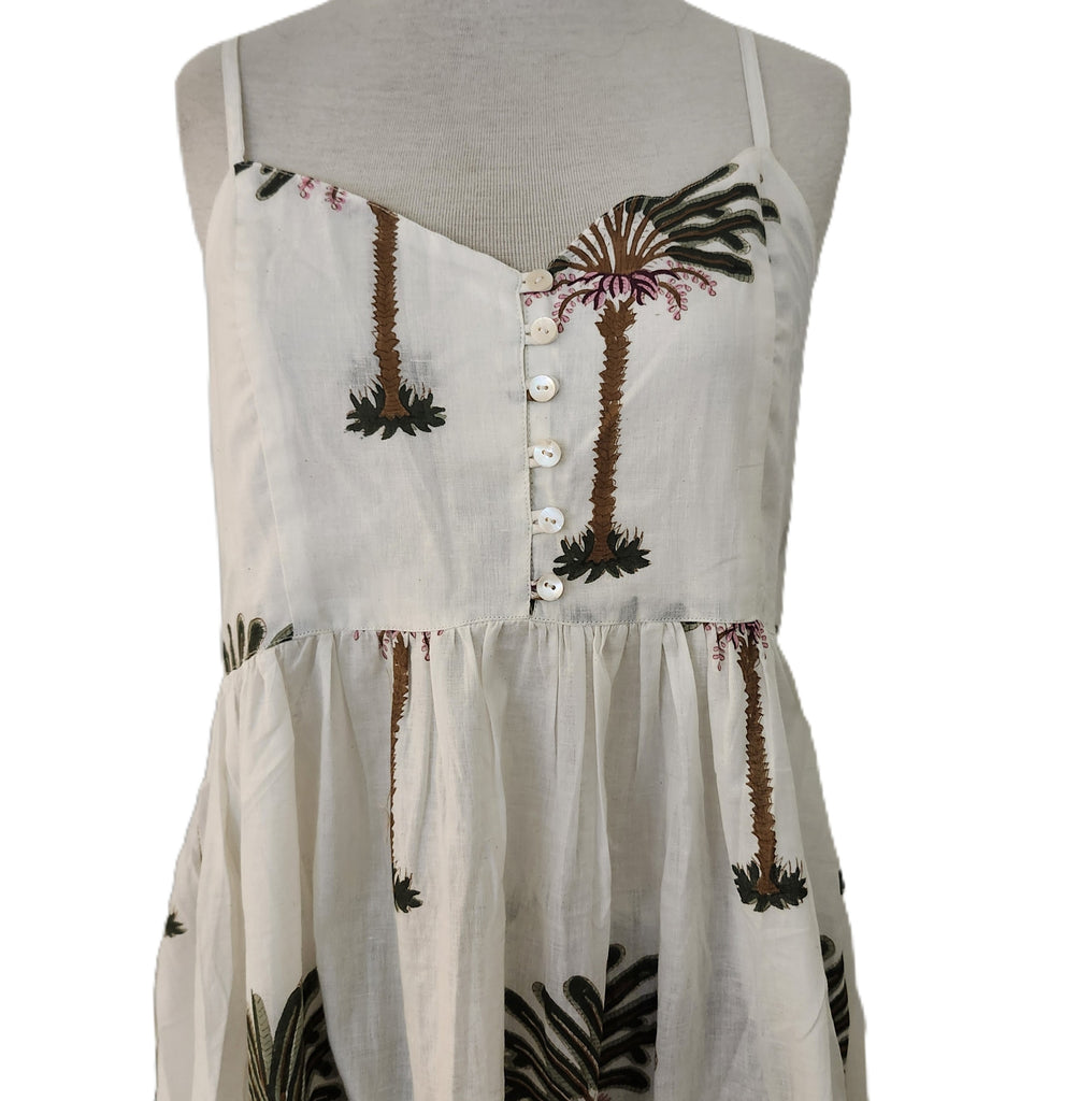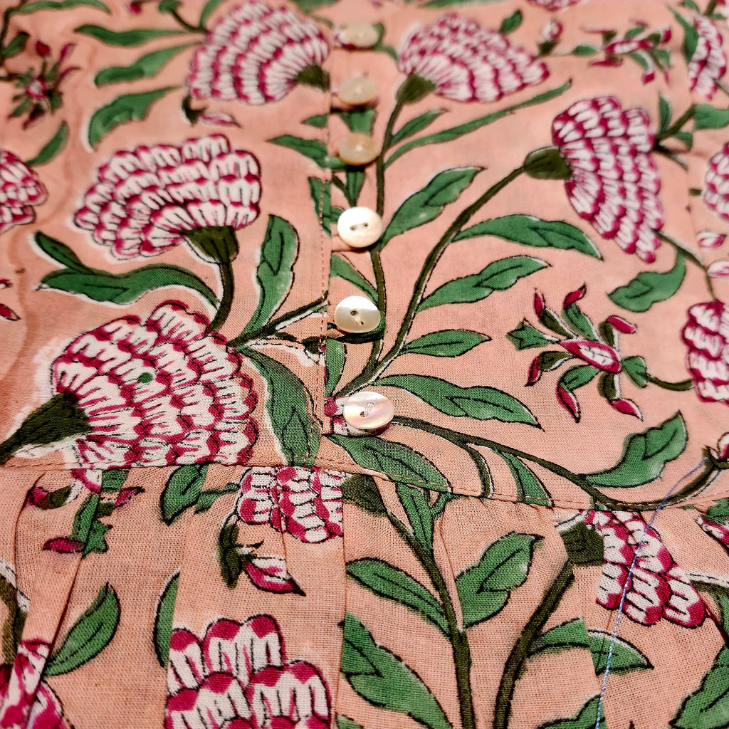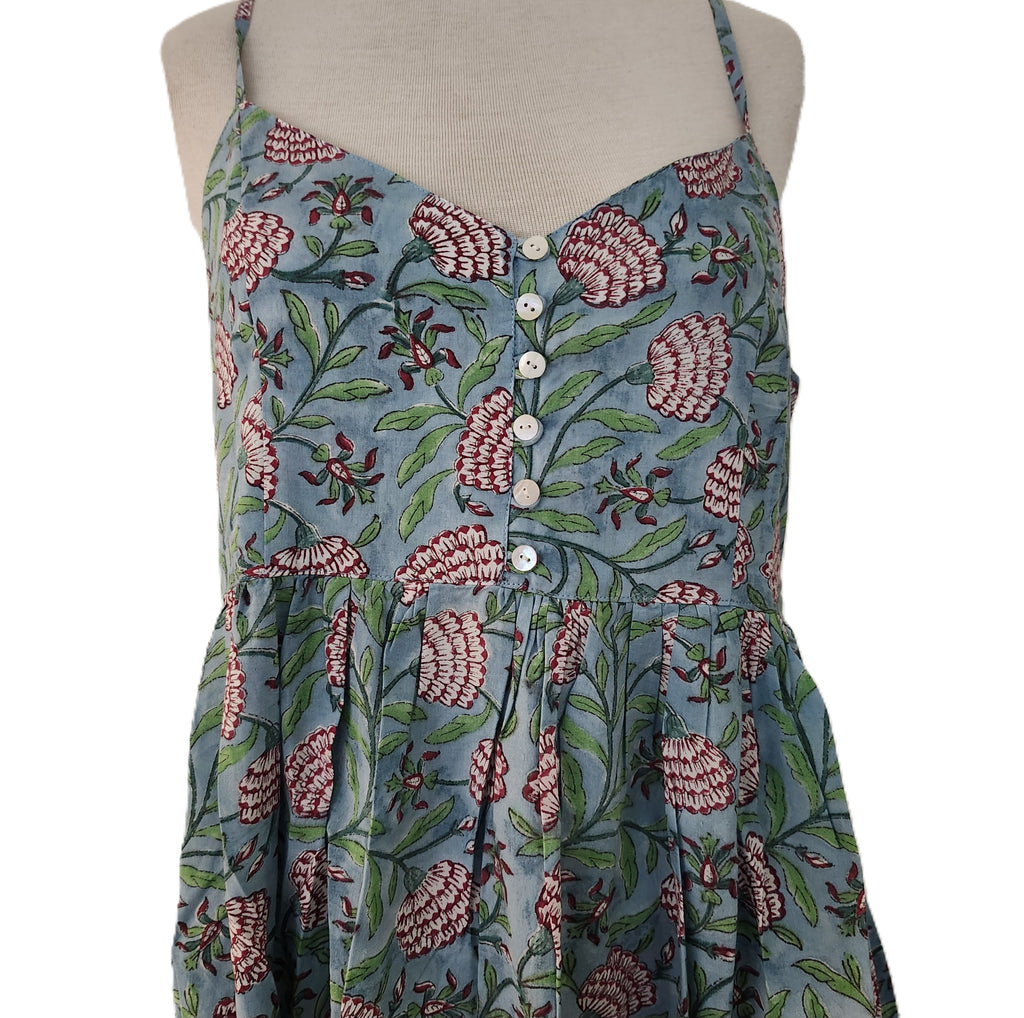 Stay cool and stylish with our block printed sundresses, in assorted patterns. Made from soft cambric cotton, the bodice features six mother of pearl buttons at the front, adjustable straps and an elasticated panel at the back for a snug and comfortable fit, and a loose calf-length skirt.
