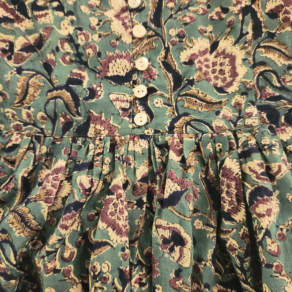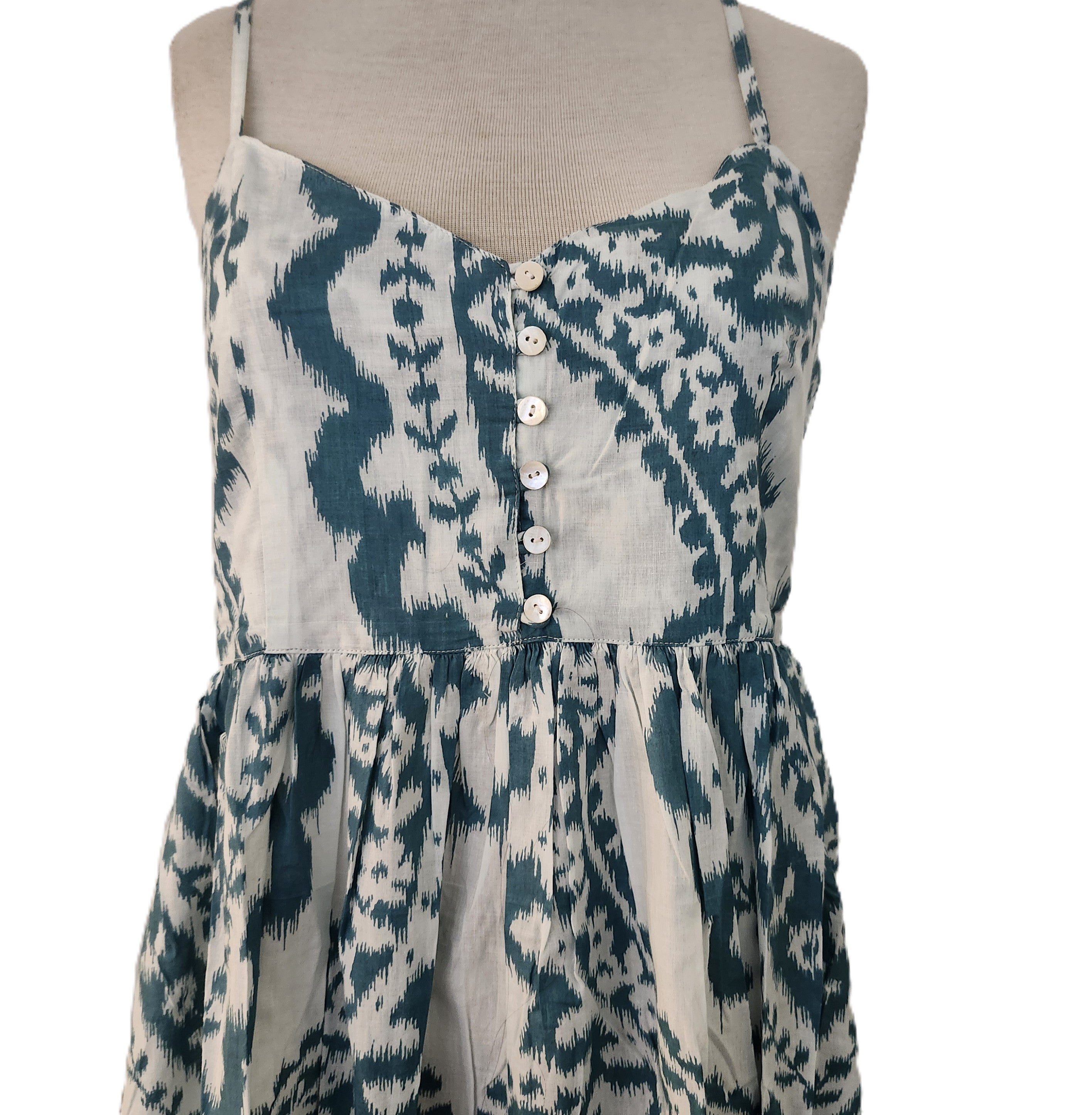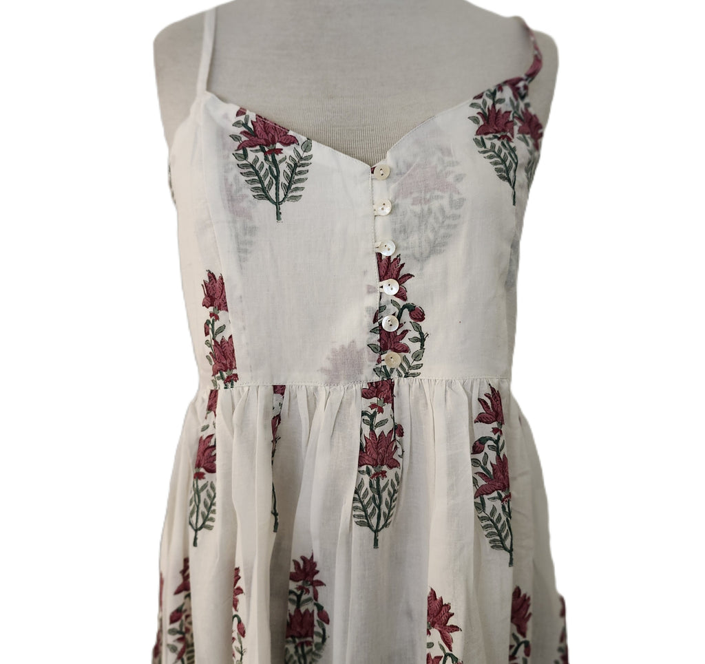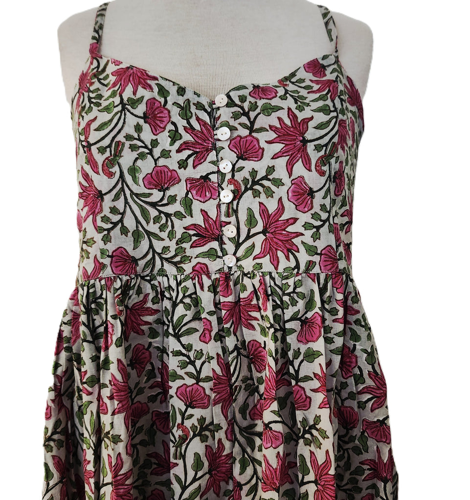 Stay cool and stylish with our block printed sundresses, in assorted patterns. Made from soft cambric cotton, the bodice features six mother of pearl buttons at the front, adjustable straps and an elasticated panel at the back for a snug and comfortable fit, and a loose calf-length skirt.