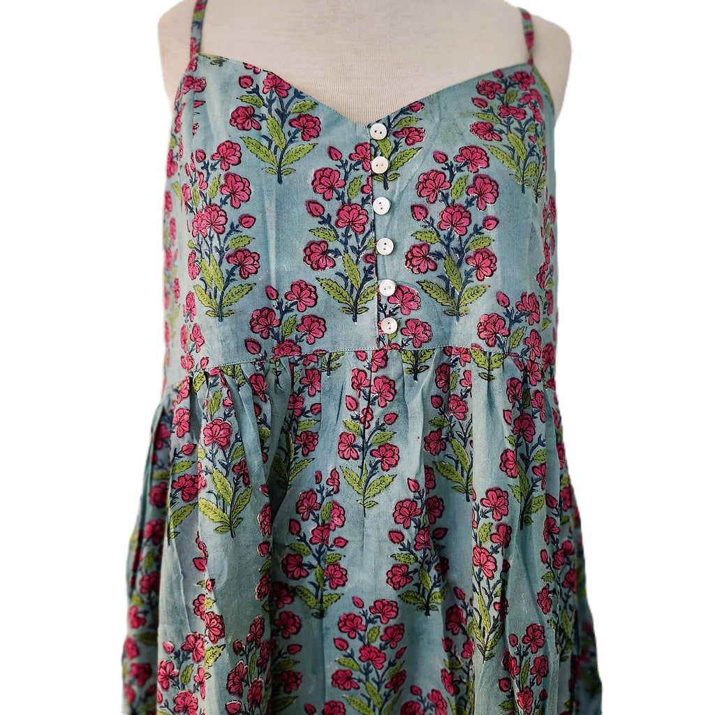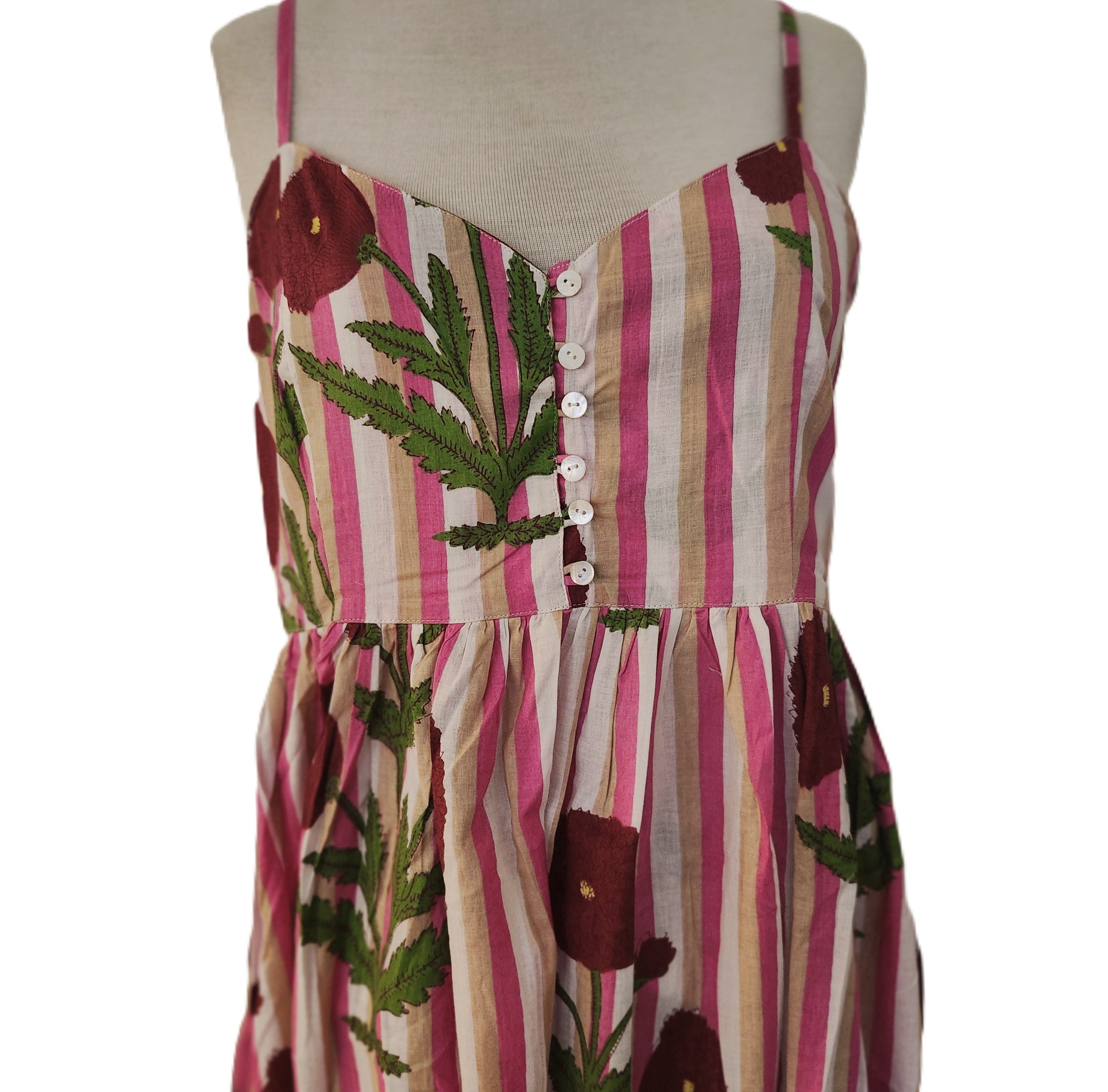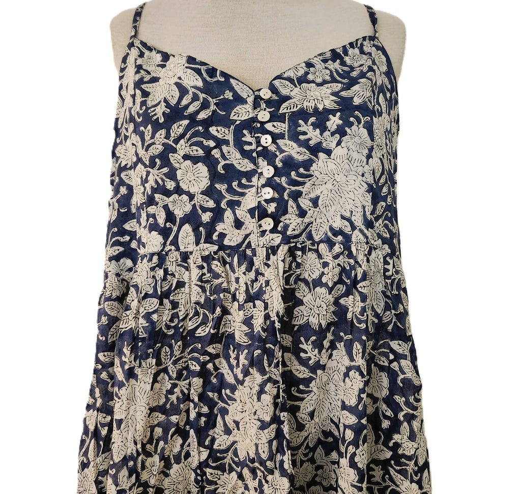 Stay cool and stylish with our block printed sundresses, in assorted patterns. Made from soft cambric cotton, the bodice features six mother of pearl buttons at the front, adjustable straps and an elasticated panel at the back for a snug and comfortable fit, and a loose calf-length skirt.
