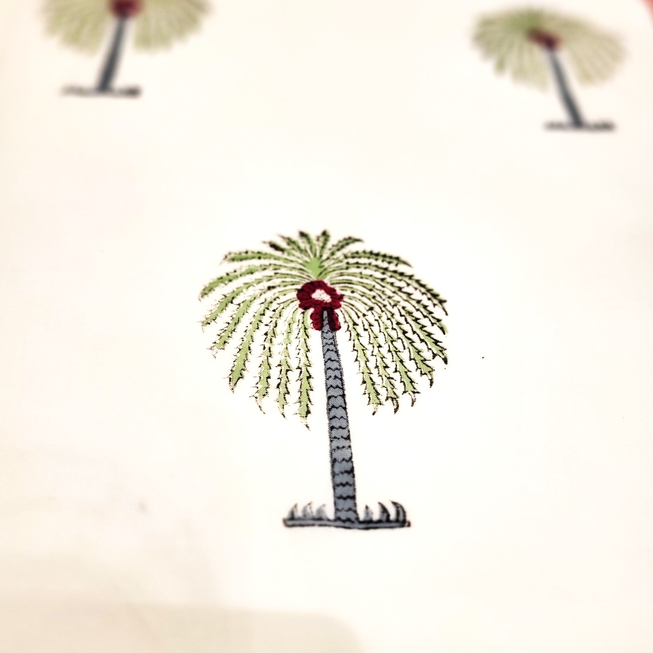 A simple but charming block-printed runner with palms, with a pale green cotton lining. We would pair it with a plain linen table cloth in white or natural, or a block print table cloth in green and white.