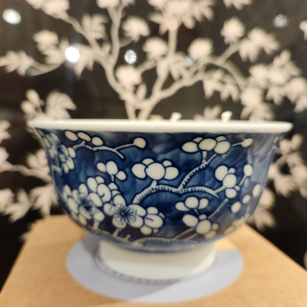 A handmade scented candle in a blue and white bowl, with a dot pattern.