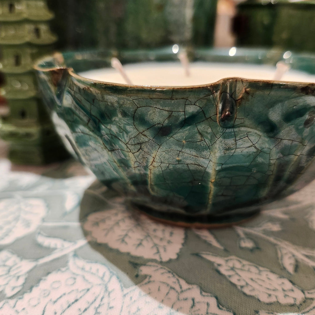 A handmade scented candle in a gorgeous green ceramic bowl.