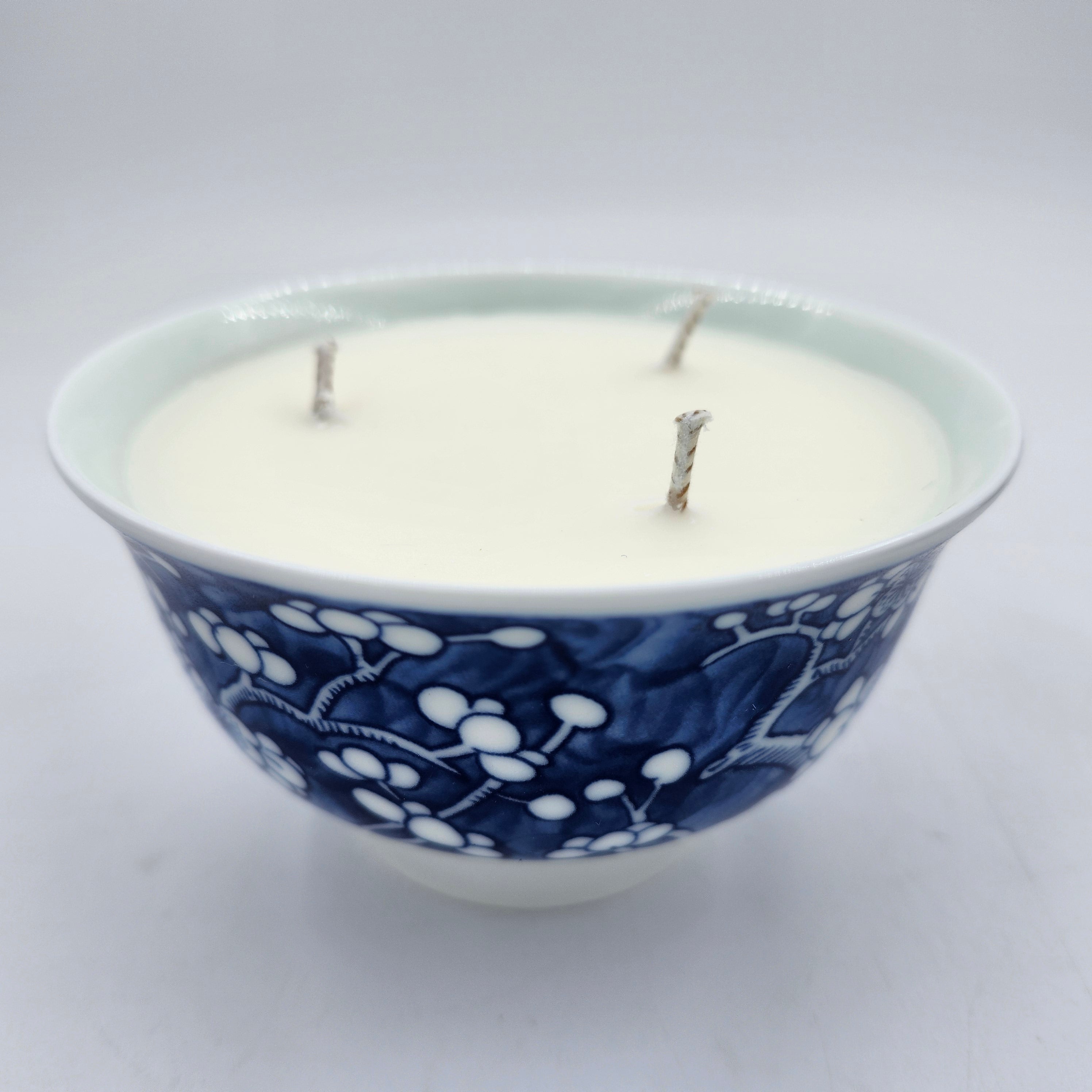 A handmade scented candle in a blue and white bowl, with a dot pattern.