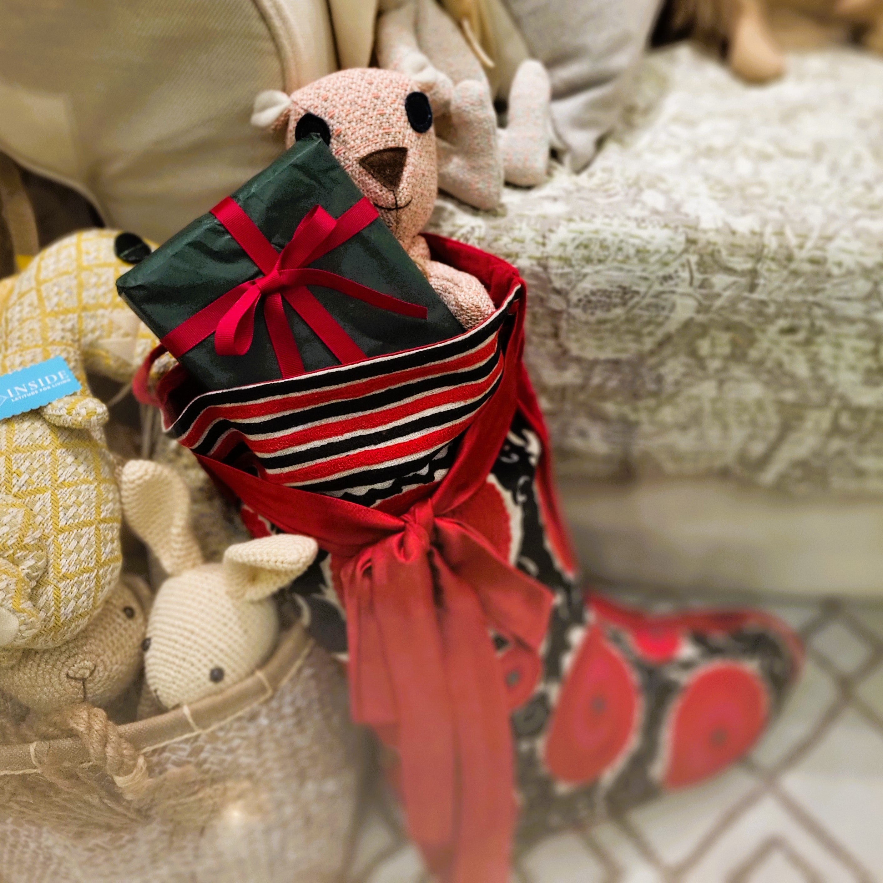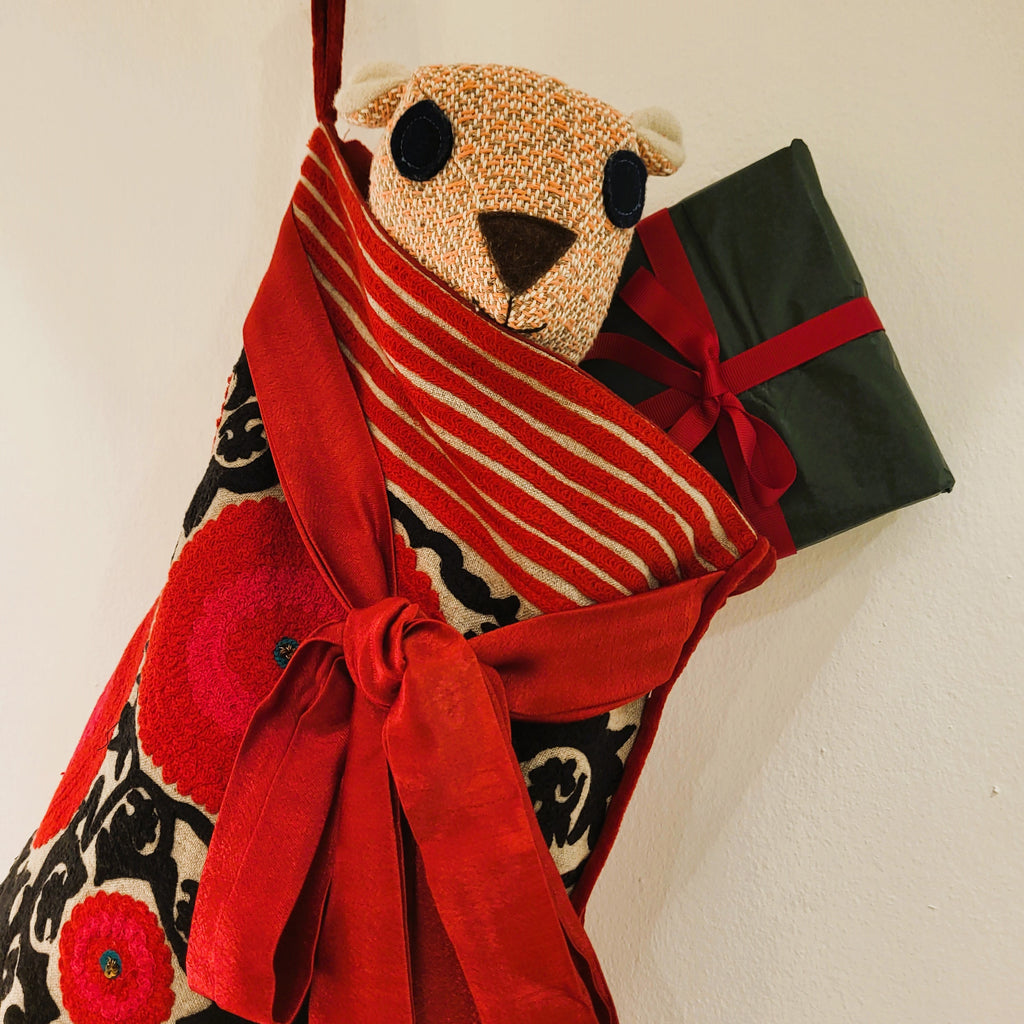 A gorgeous, hand-embroidered Christmas stocking, with a striking suzani pattern, which is special enough to become an heirloom. It features bright red circles, and finished with stripes at the top (available in three different colourways). It is finished with a silky red ribbon.