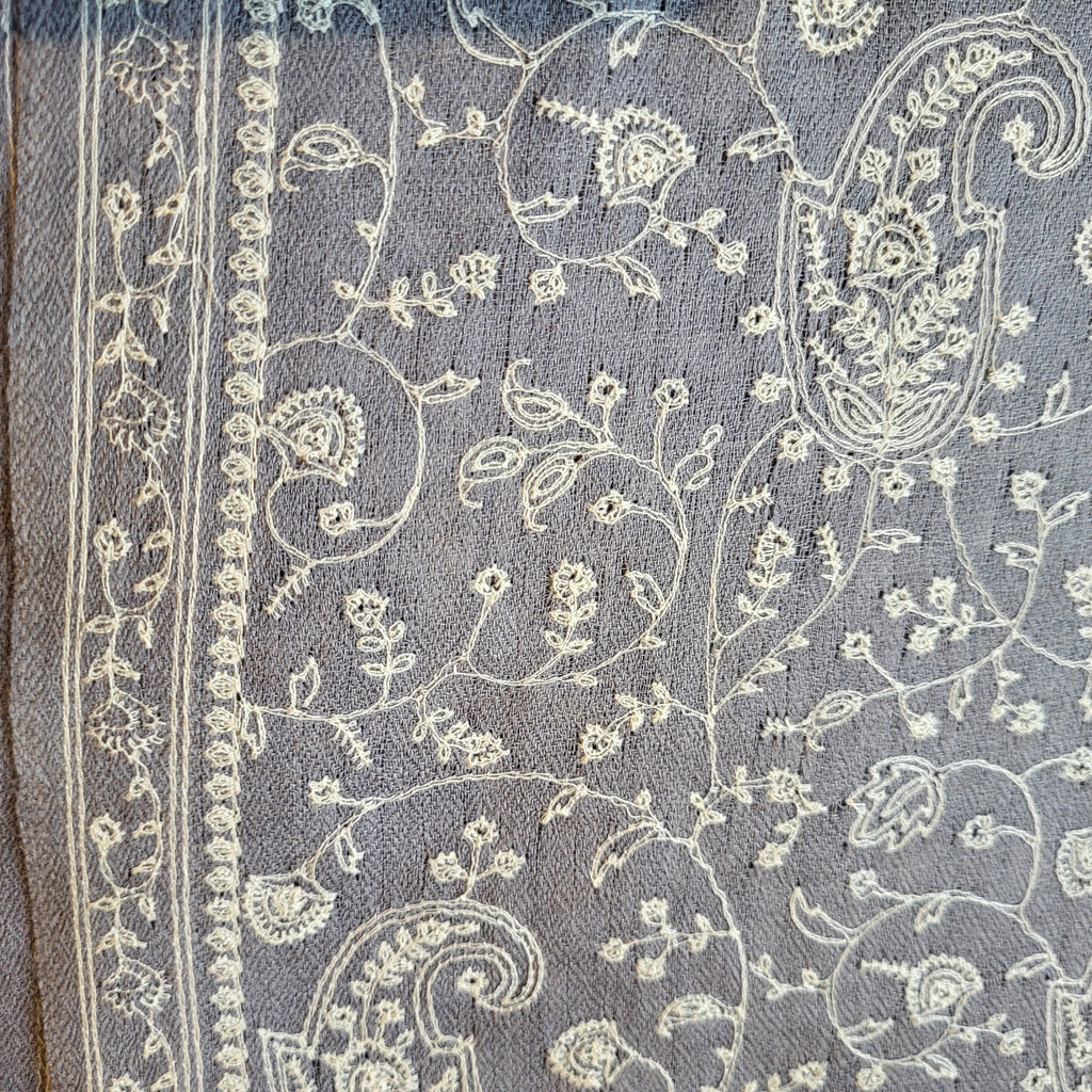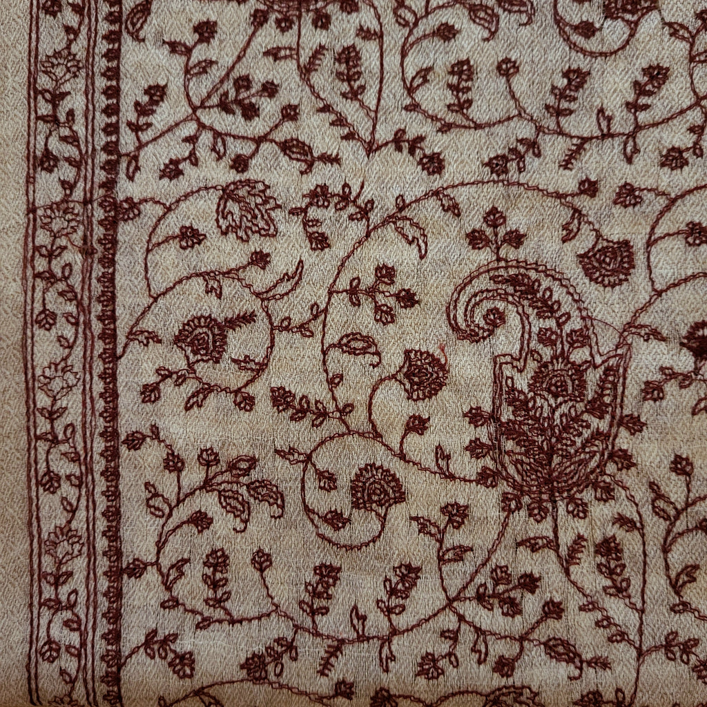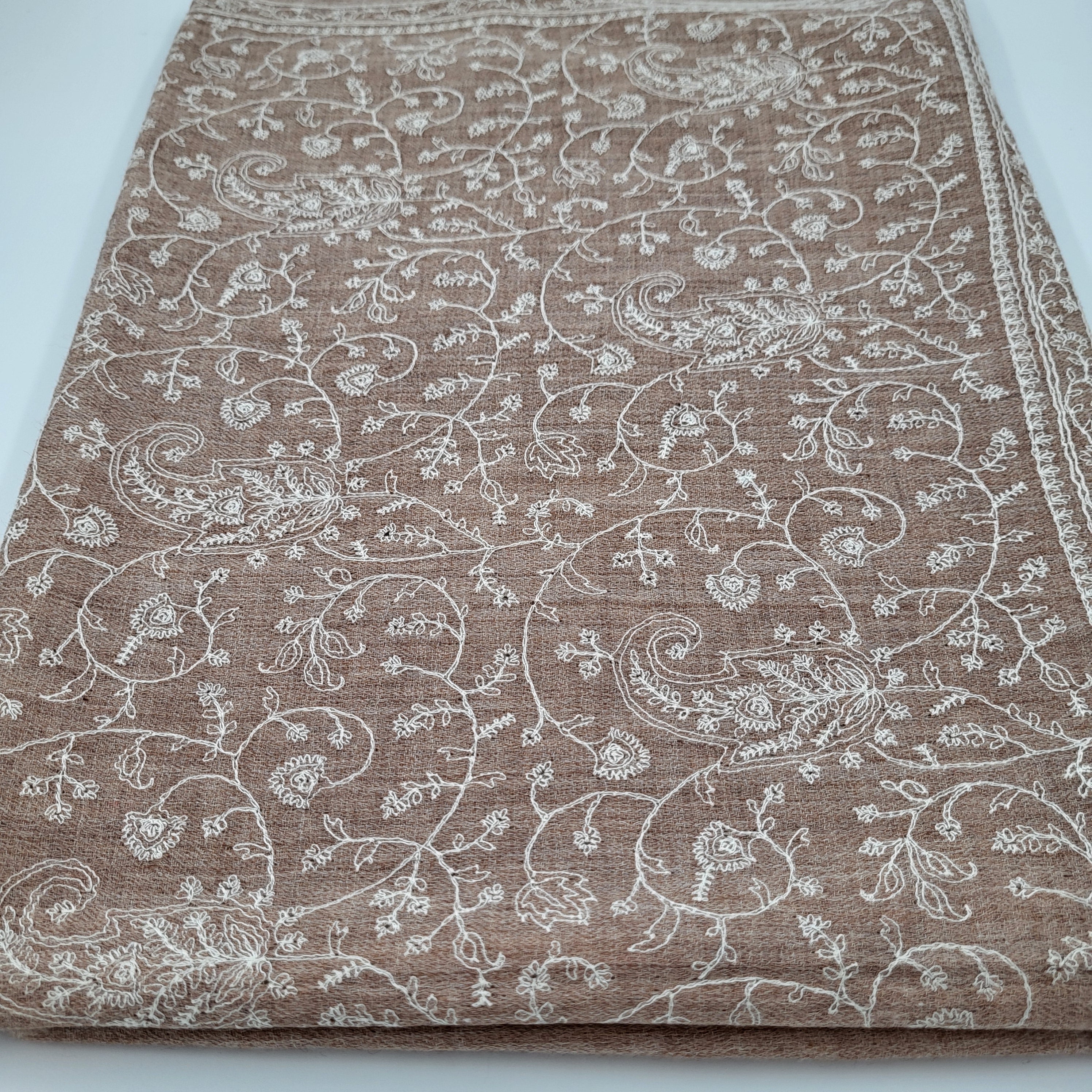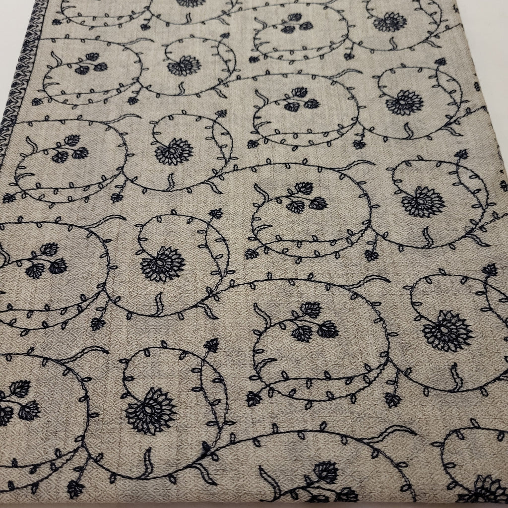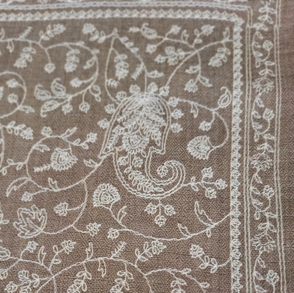 Artisans with the skill and patience to hand embroider are becoming rarer, and machine embroidery has improved significantly in quality. We have selected these products because their appearance and feel is very close to a hand-embroidered product. Embroidered all over, apart from a plain border at either end. Available in a few colours in either floral or paisley design.