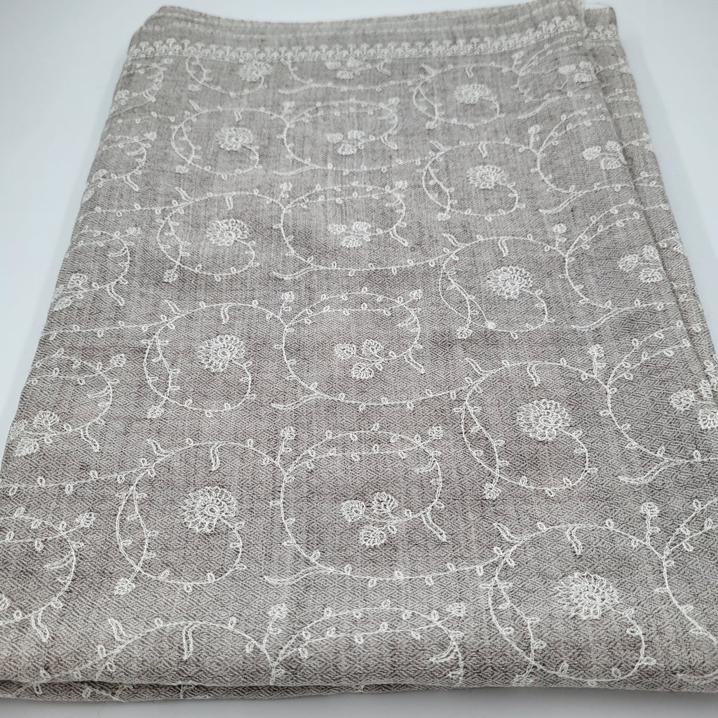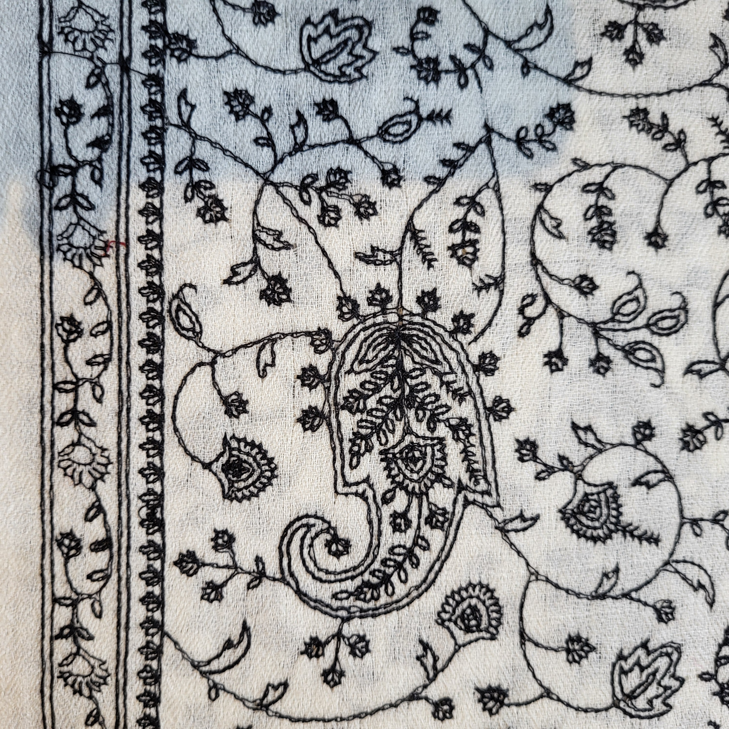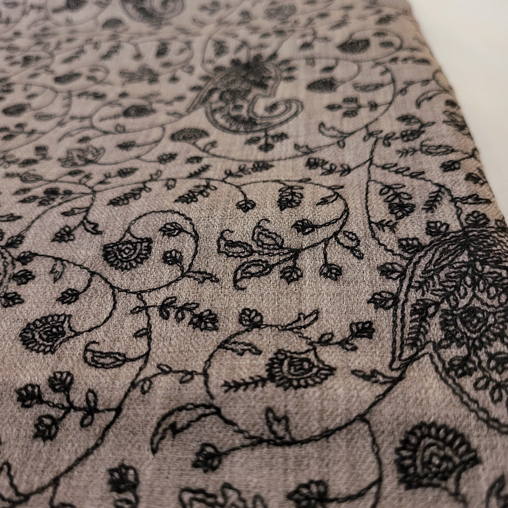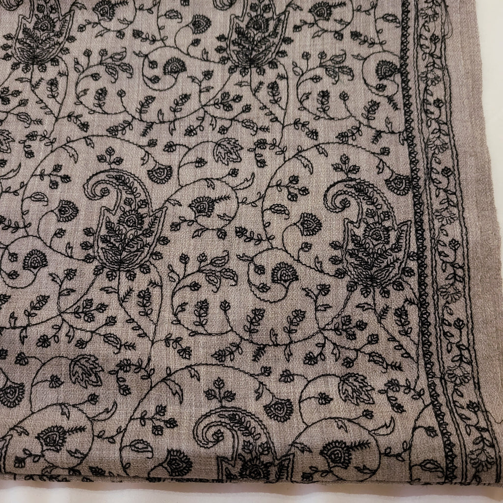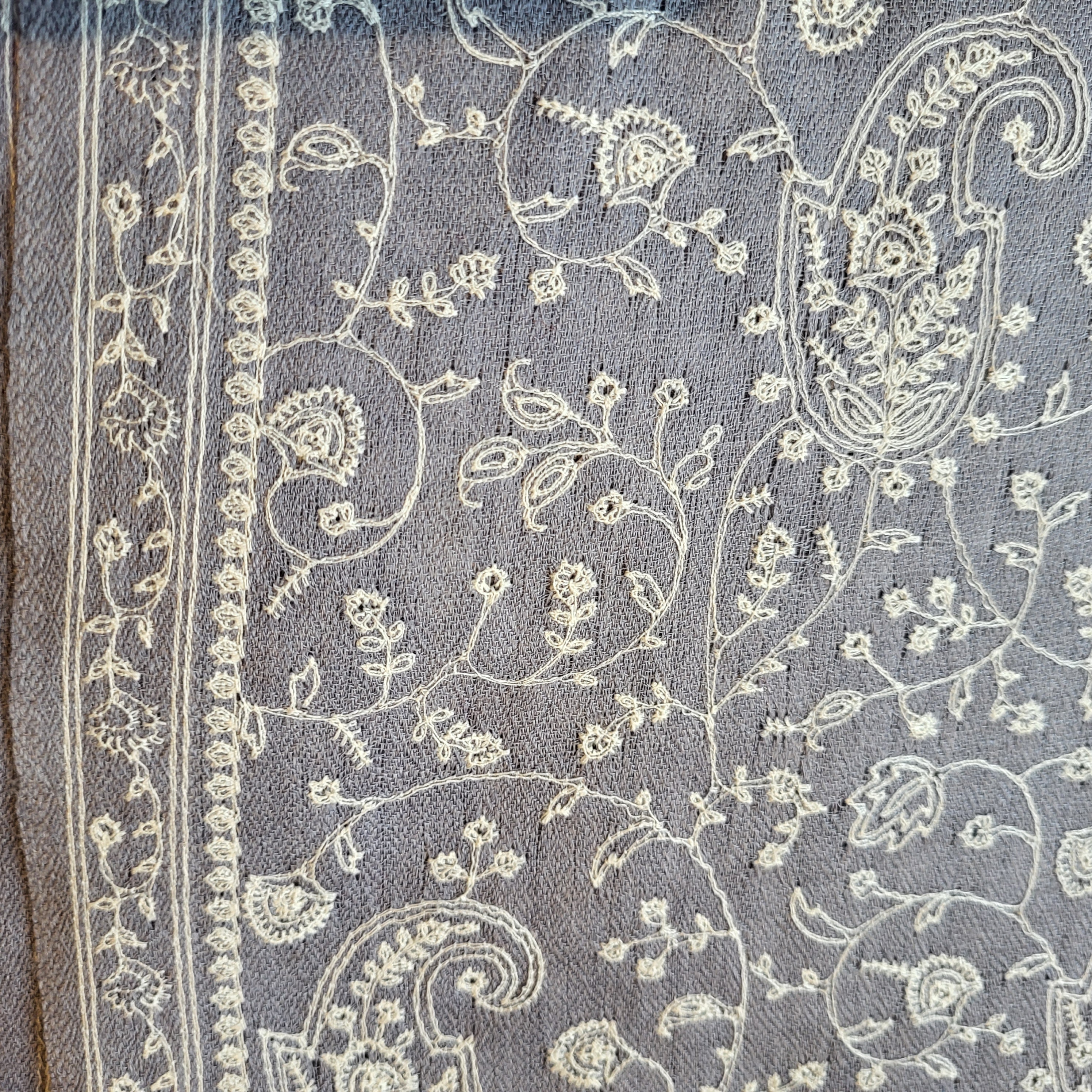 Artisans with the skill and patience to hand embroider are becoming rarer, and machine embroidery has improved significantly in quality. We have selected these products because their appearance and feel is very close to a hand-embroidered product. Embroidered all over, apart from a plain border at either end. Available in a few colours in either floral or paisley design.