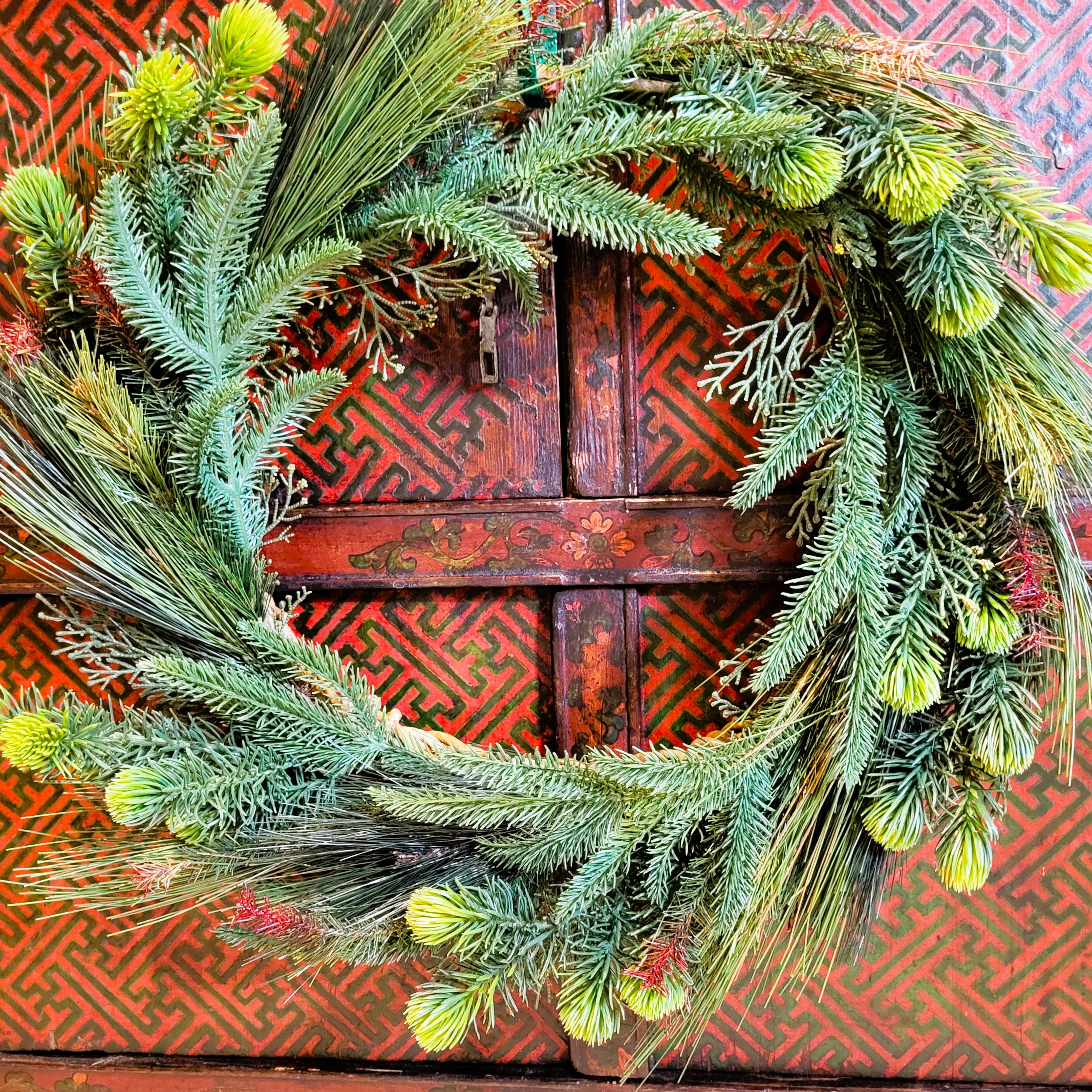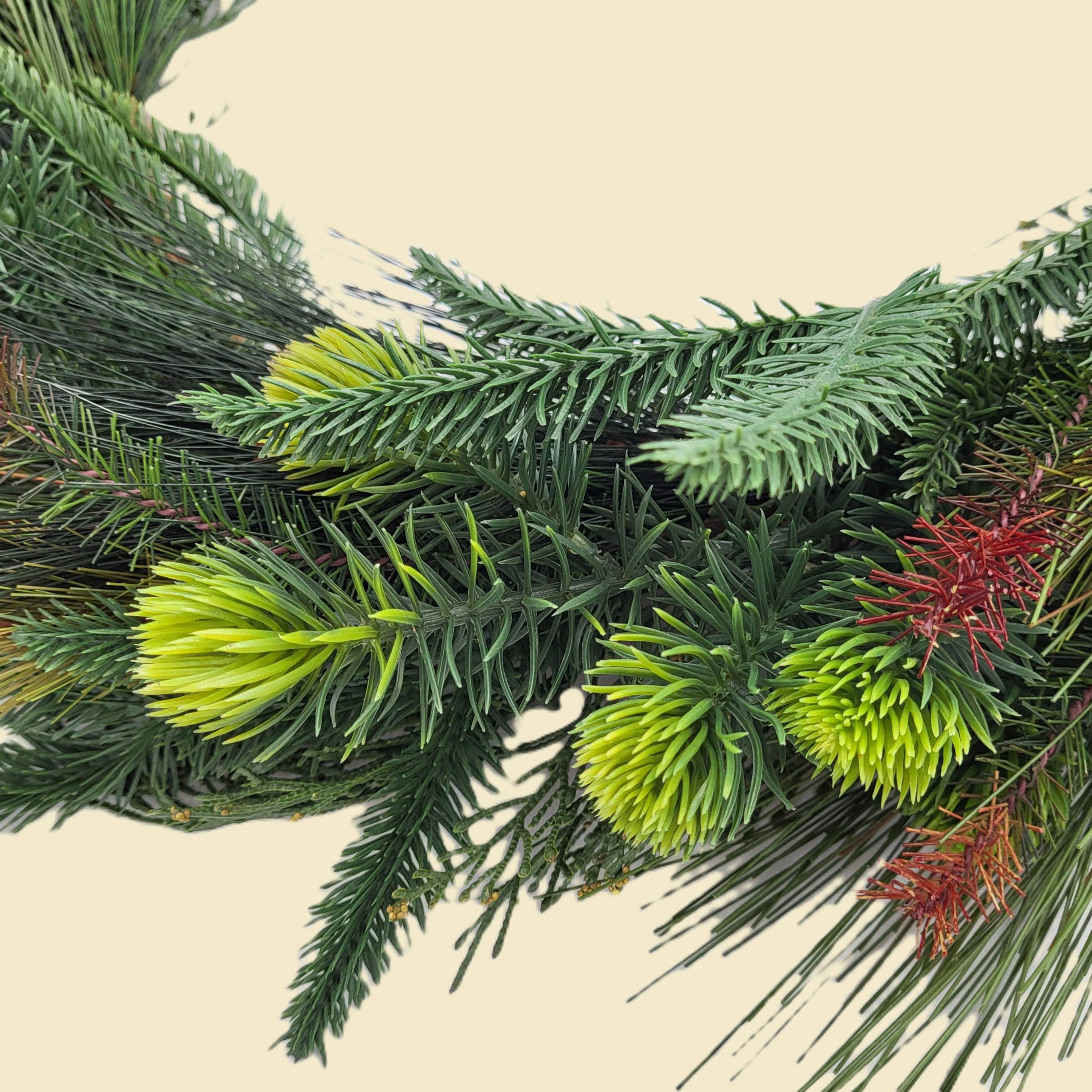 A simple but elegant faux fir Christmas wreath to add a festive touch to your door. Of course there is nothing quite like the real thing, but from an environmental point of view, this should last for years, and it hasn't had to travel in a refrigerated container.