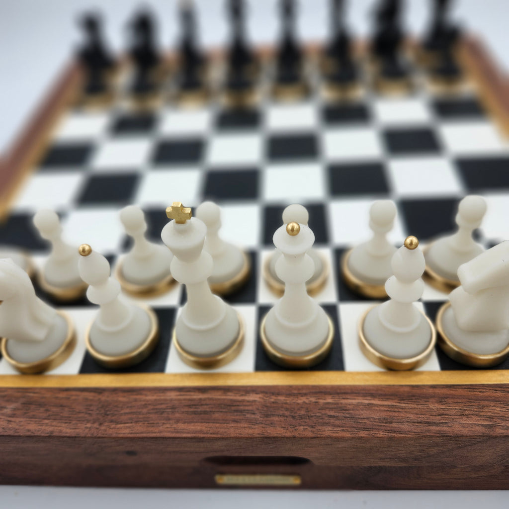 - Unique resin-concrete chess pieces for durability and distinction, with brass bases