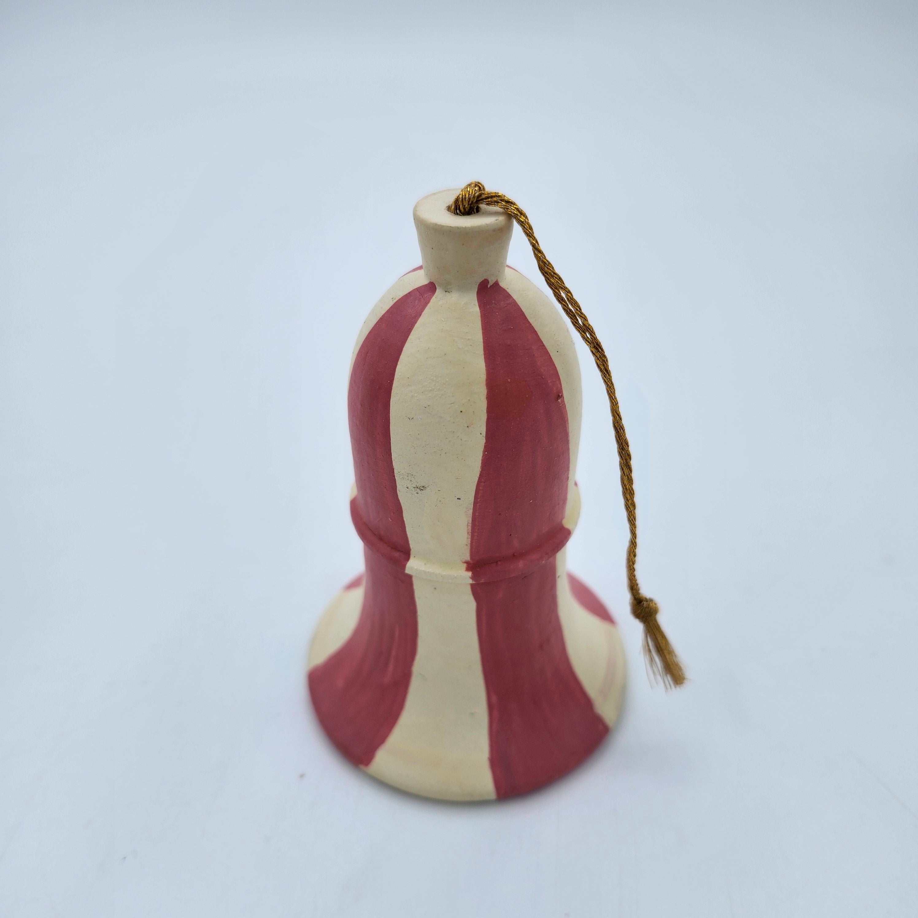Handmade from papier mache in Kashmir, these delightful Christmas decorations have been individually hand-painted in cream with a broad pink stripe and finished with a matte varnish. They have a plain gold thread with a small tassel for hanging.