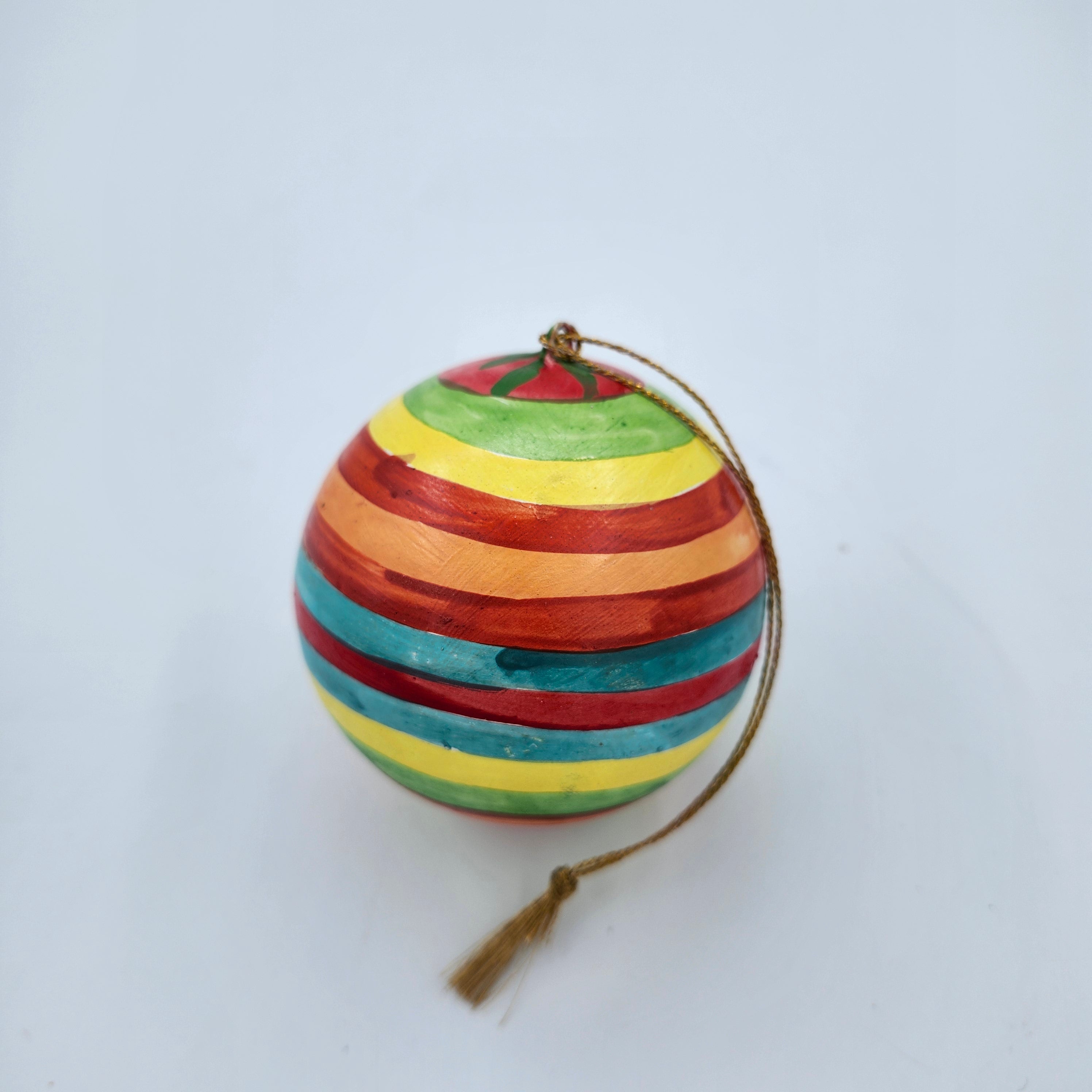 Handmade from papier mache in Kashmir, these delightful Christmas decorations have been individually hand-painted in rainbow colours and finished with a matte varnish.    They have a plain gold thread with a small tassel for hanging.