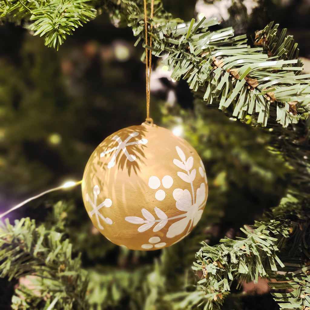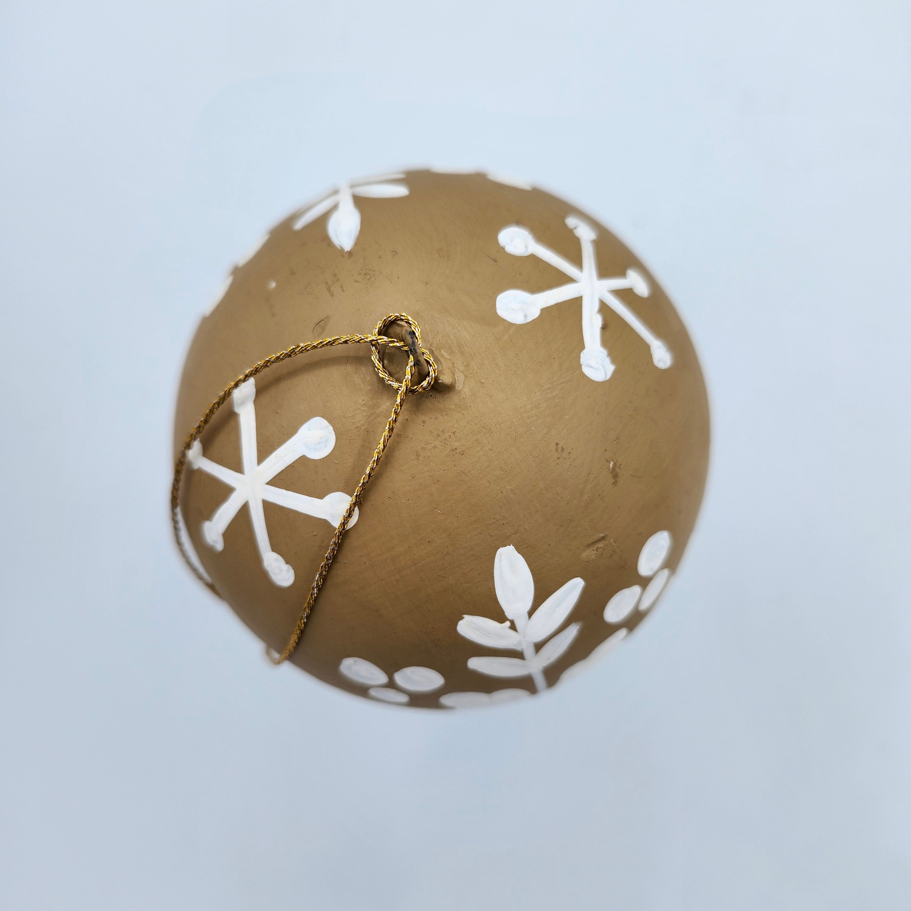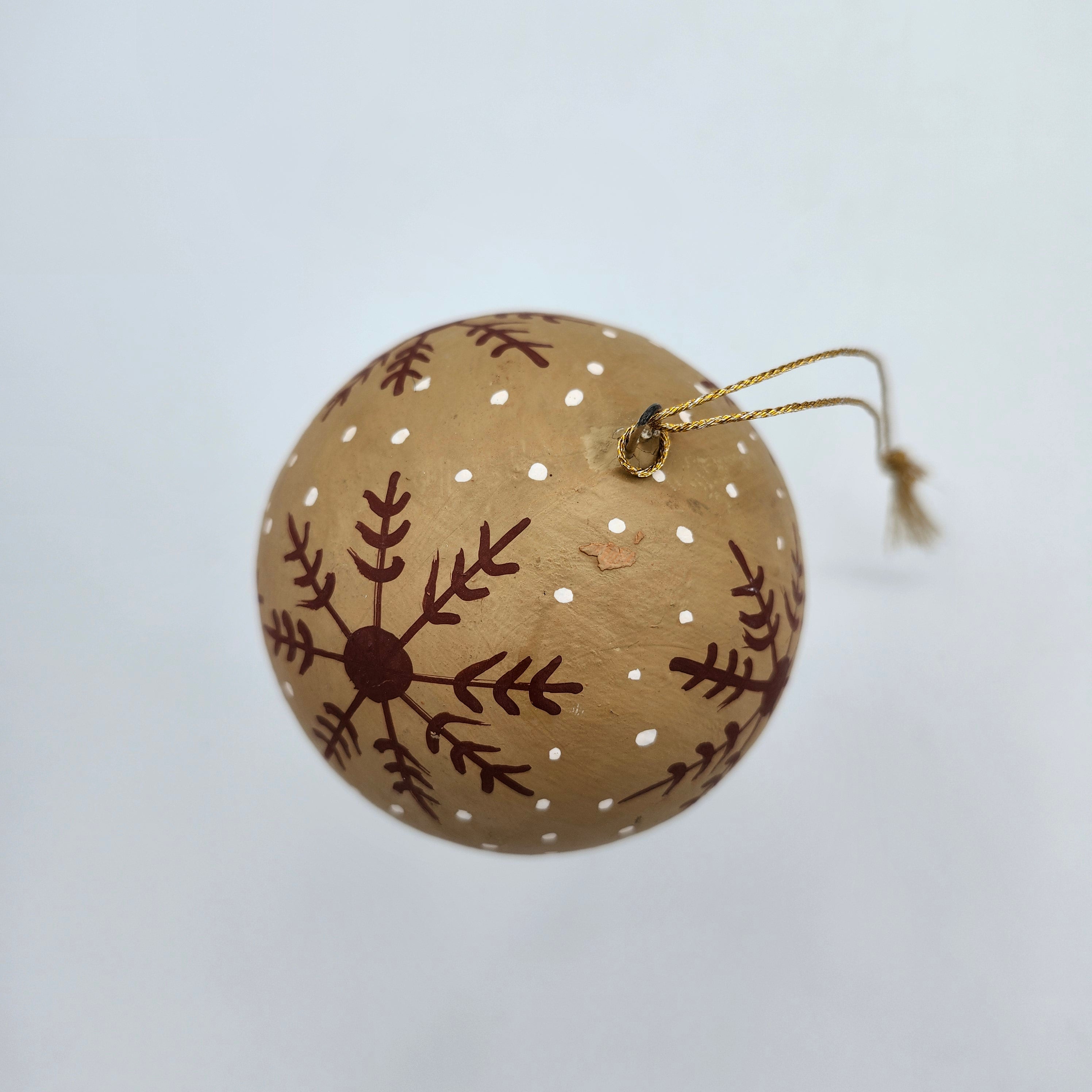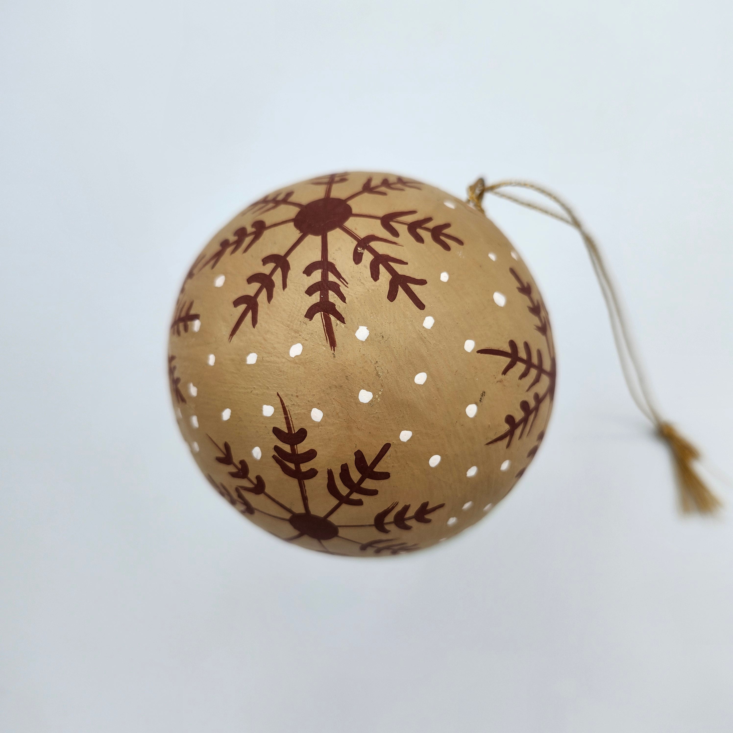 Handmade from papier mache in Kashmir, these delightful Christmas decorations have been individually hand-painted with a snowflake desgin on a ntaural background and finished with a matte varnish. Each has a plain gold thread with a small tassel for hanging.