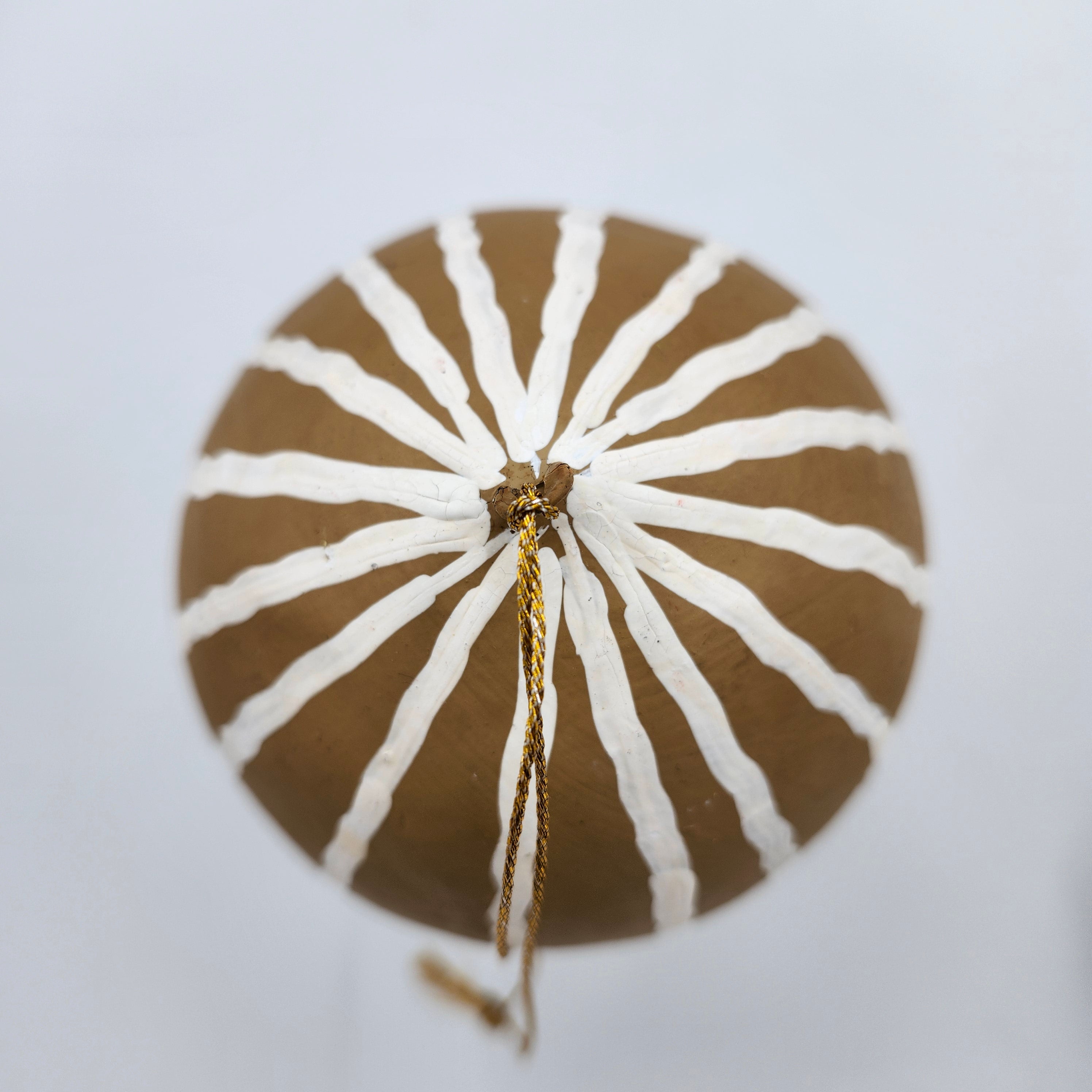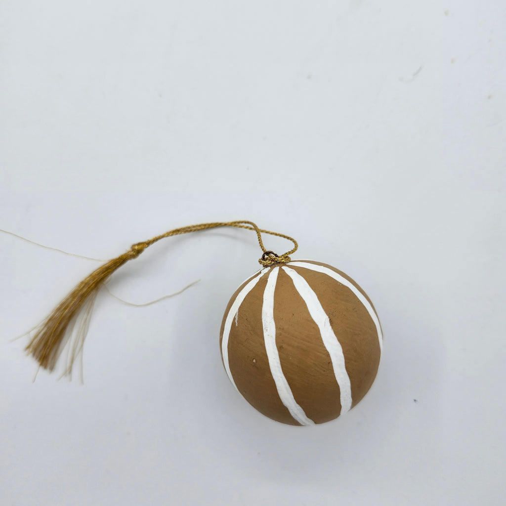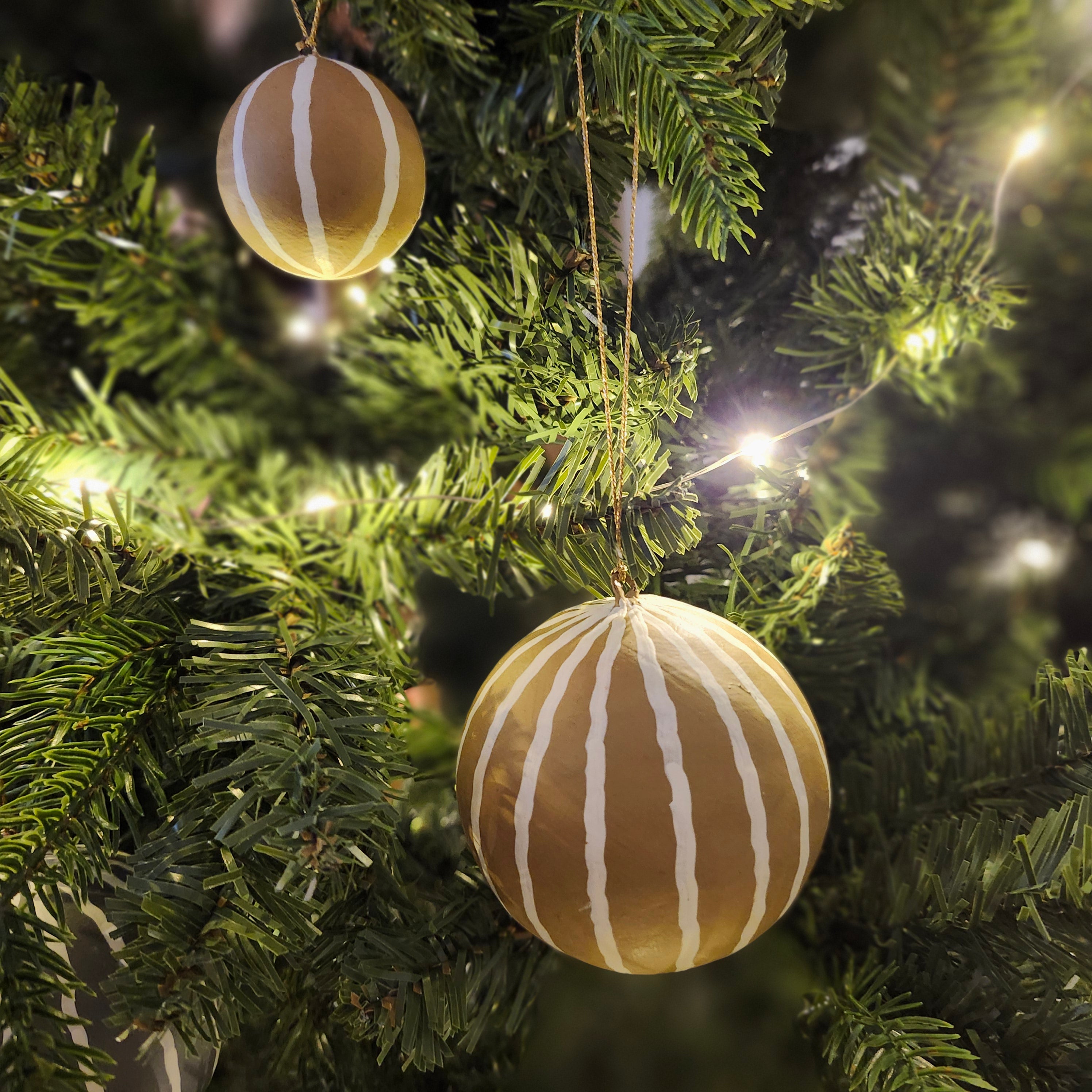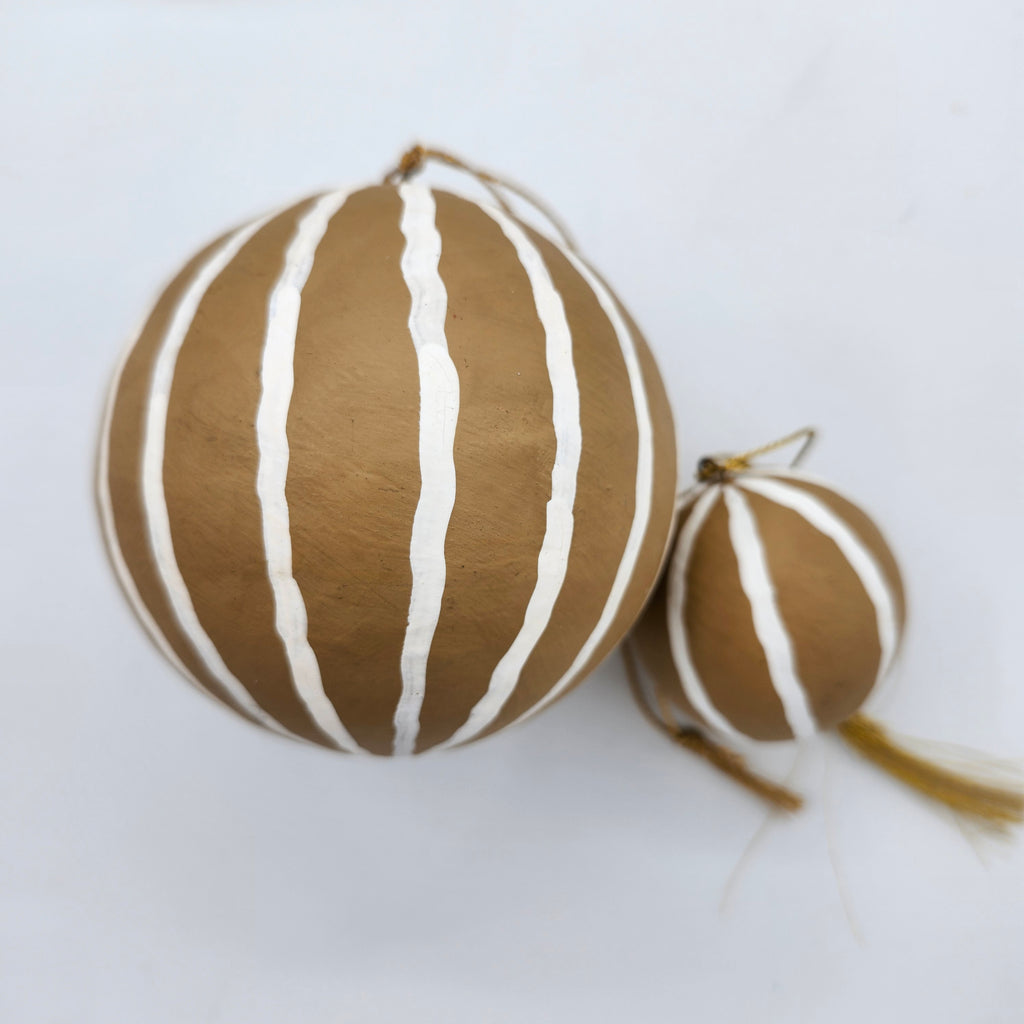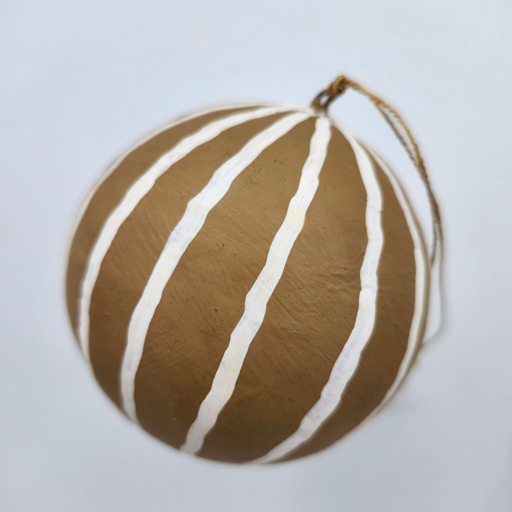 Handmade from papier mache in Kashmir, these delightful Christmas decorations have been individually hand-painted in natural with white stripes and finished with a matte varnish. They have a plain gold thread with a small tassel for hanging.