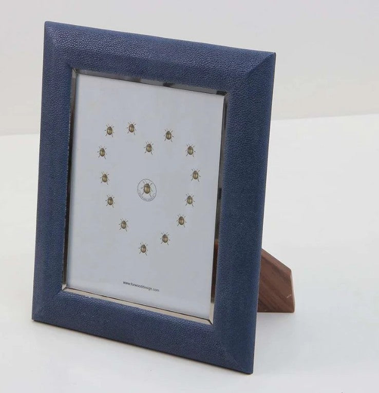 Forwood Design's classic Bella Photo Frame in Nile Blue shagreen is made by craftsmen in faux shagreen with stainless steel trim. The frames frames are beautifully backed with polished walnut wood. The large frame fits 8″x 10″ photos and the small frame holds 7″ x 5″. Both sizes of photo frames work horizontally or vertically.