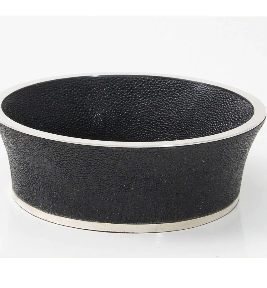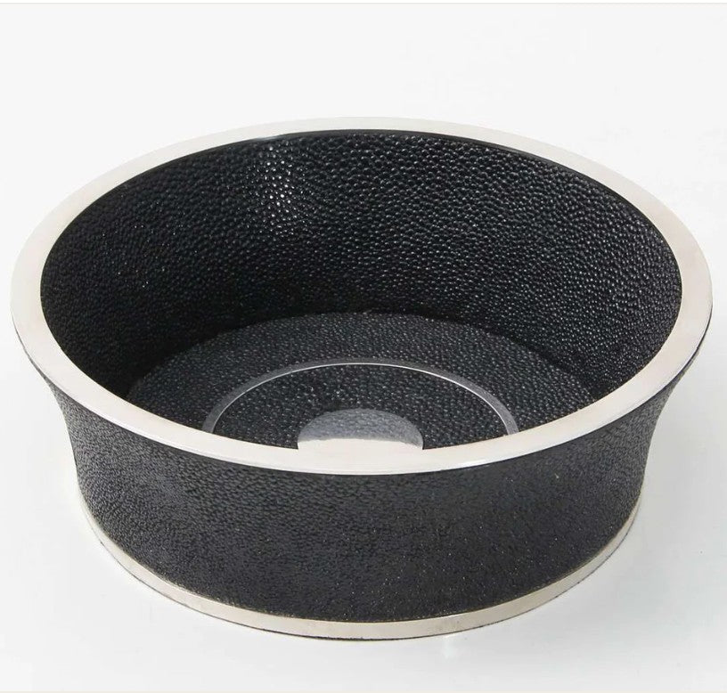 Set off your dining table with our luxurious wine bottle coaster in jet black shagreen. They are made from Forwood Design's exclusive faux shagreen and stainless steel. The wine coasters are designed to fit and display both wine and champagne bottles comfortably. The coaster acts as a moisture barrier between a cold wine bottle and a warm tabletop preventing a water ring. The coasters make perfect wedding gifts and stylish Christmas and birthday presents.