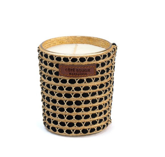 This candle is finished in Sabra, or Cactus Silk, in black and gold, which has been beautifully crafted by hand in Morocco. The candle is scented with an incense fragrance.