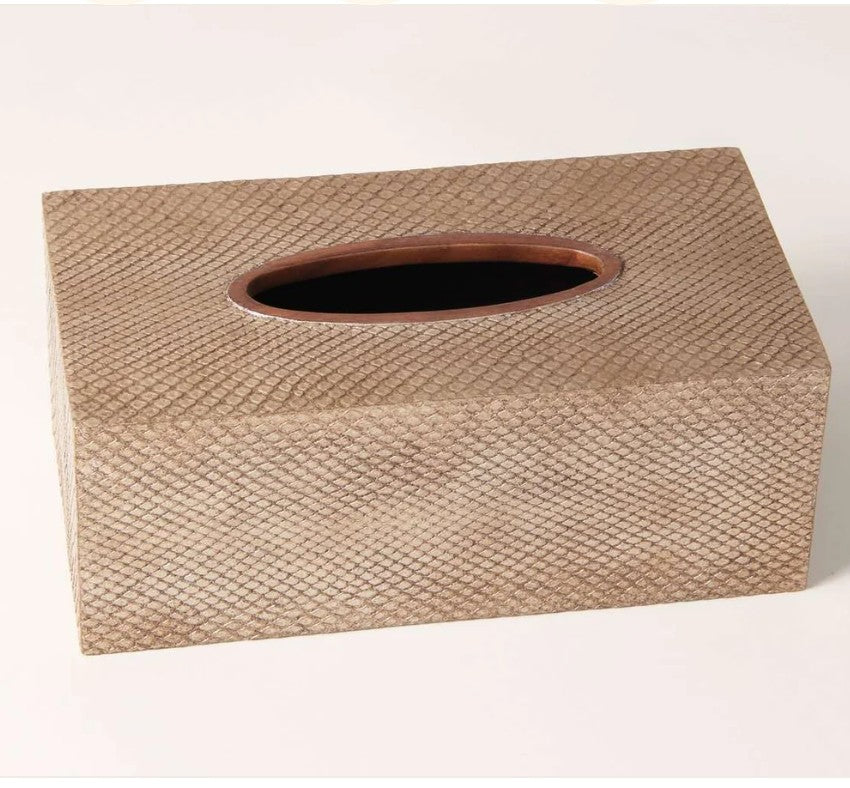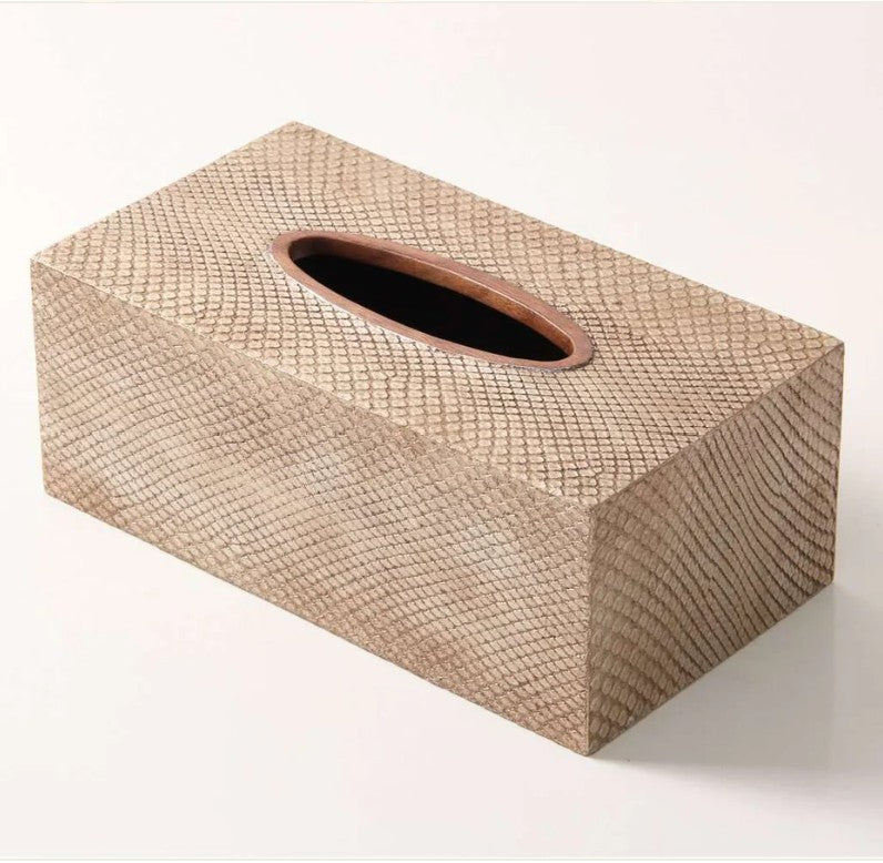 This designer Tissue Box Cover in antique silver boa leather is an interior designer’s delight. It uses a combination of faux boa leather and a walnut wood trim. The tissue box holder is ideal for offices, hotels and of course home use. It brings a subtle touch of elegance to your interior decoration and will suit both modern and traditional room settings. Covering a tissue box will of course instantly make it look more aesthetic, luxurious and expensive. This tissue box holds standard rectangular sized tissues and is easy to clean and storage friendly.