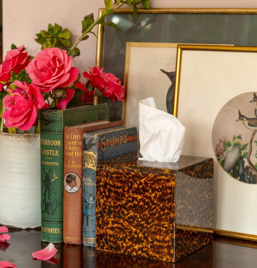 The Tortoiseshell Tissue Box brings timeless elegance to any setting, designed by Henry Forwood using his exclusive faux tortoiseshell finish. Inspired by the rich, mottled beauty of the traditional material, this ethical and sustainable version transforms a functional item into a refined interior accent.