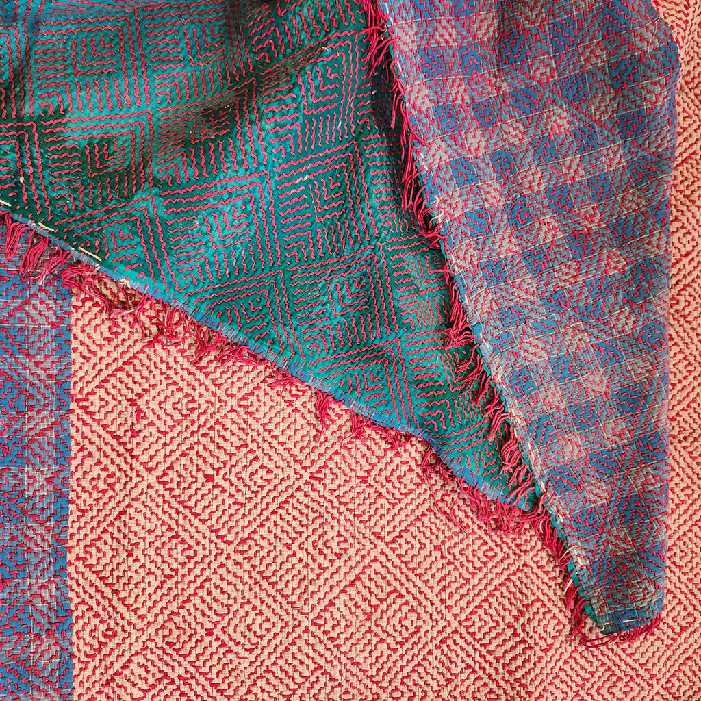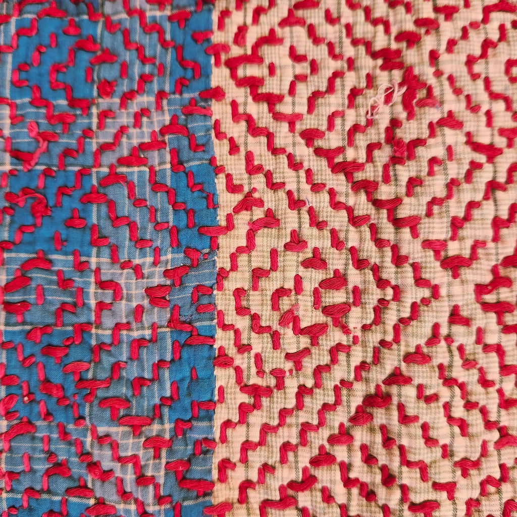 Kantha is a type of quilt, made without padding, but by sewing together layers of cloth, usually with a running stitch. It is a centuries-old tradition, originating in Bengal, and was a way to recycle old cloth, typically saris, but also as a form of artistic expression, with each piece reflecting the skill and taste (or not!) of its maker.
