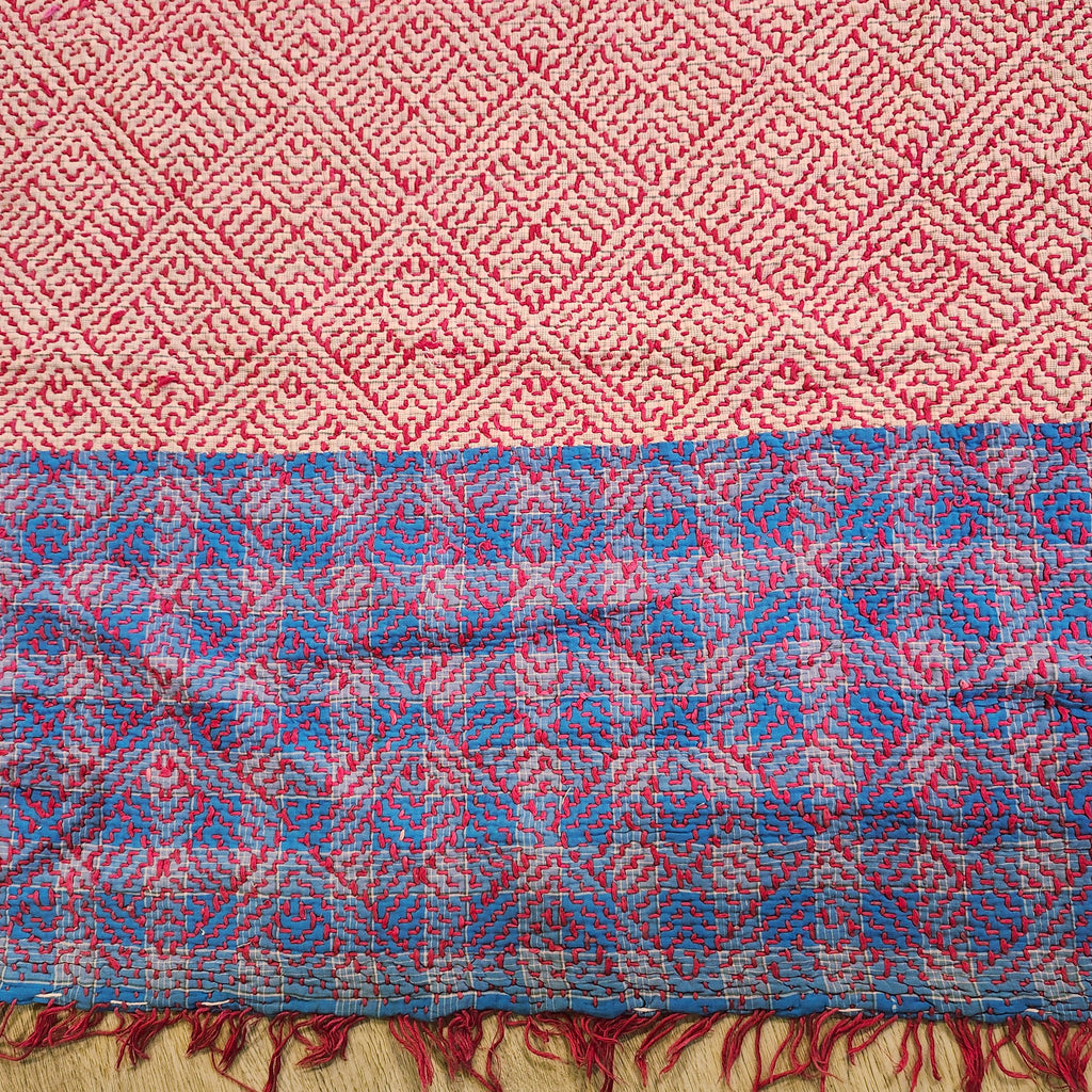 Featuring a glorious turquoise with pink stitching on one side, and red and white with checks on the other, this vintage kantha offers two very different looks. It has a beautiful red fringe.