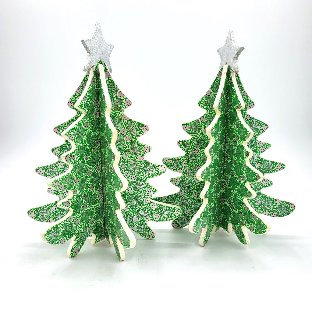 Tis the season to be jolly! These cute Christmas trees, made in papier mache on wood and hand painted with green leaves and red berries on a silver background, are the perfect eye-catching addition to your festive table setting. Each comes as a set of 3 pieces which slot together to create the tree, but can be flat packed for storage. One size only.