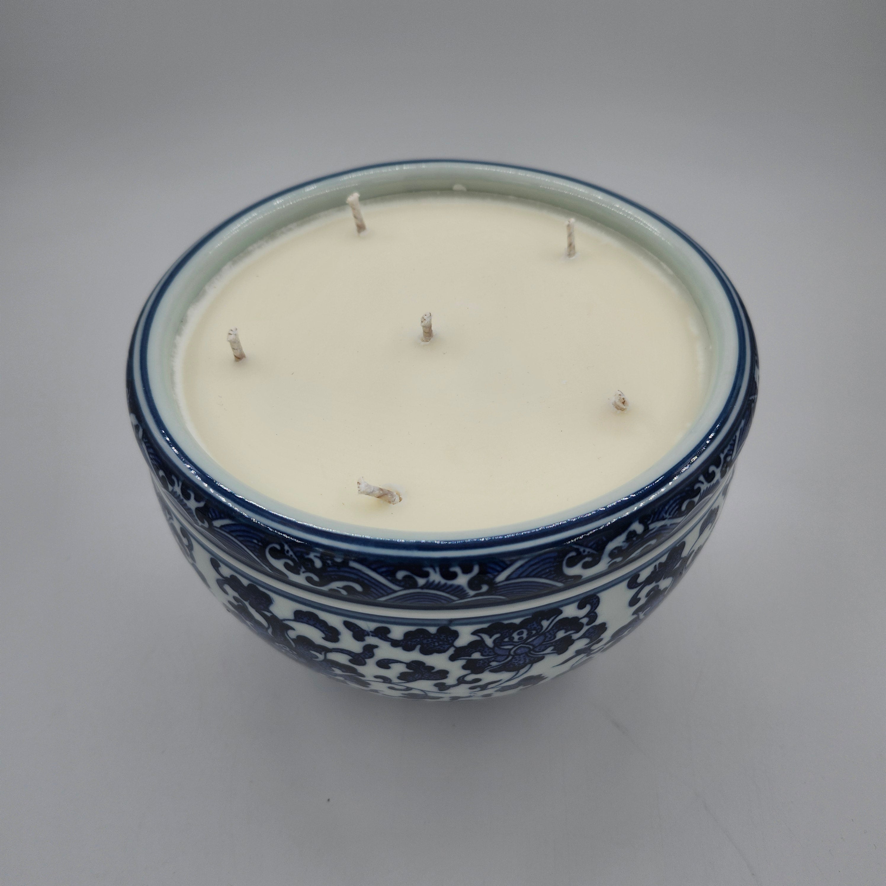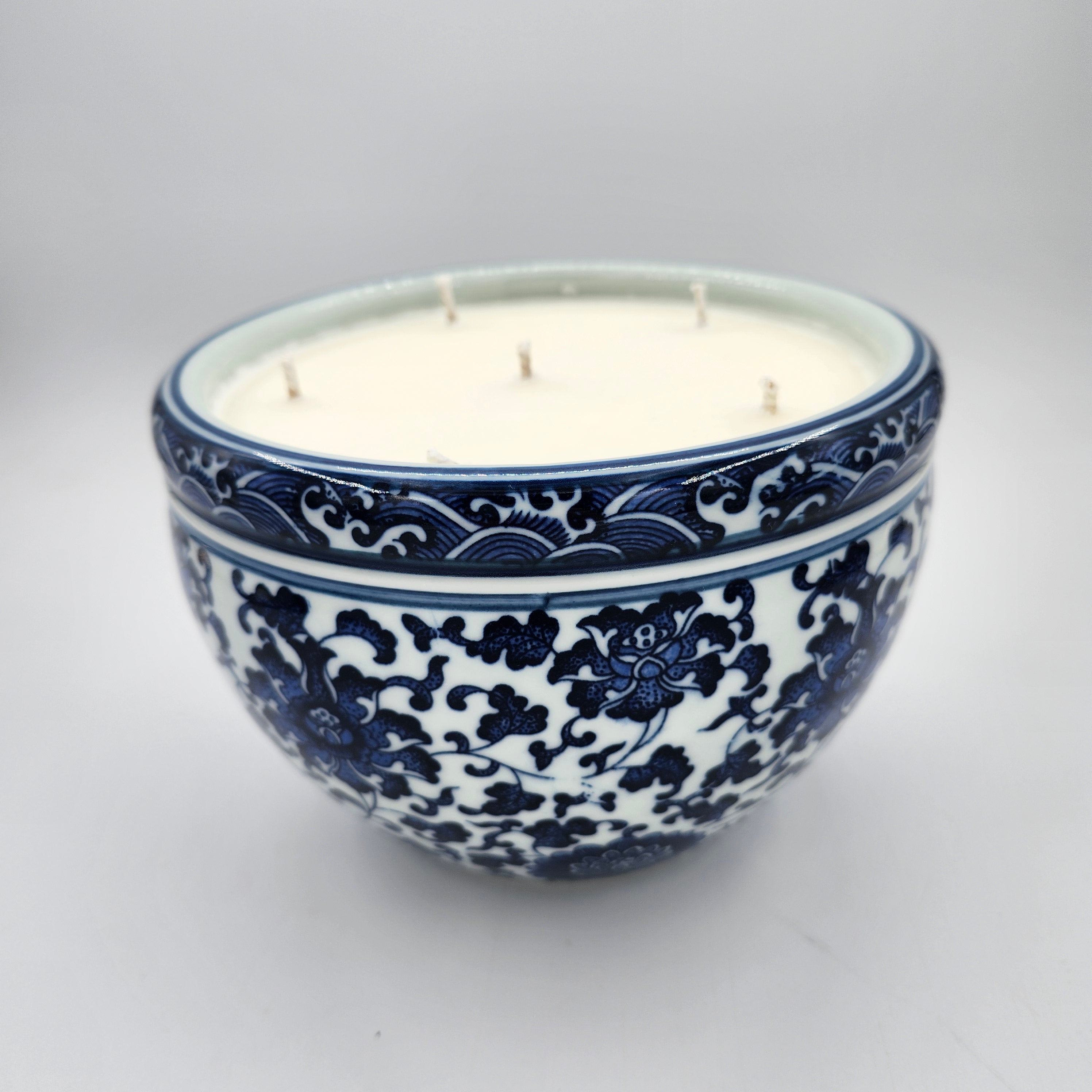 A handmade scented candle in a stunning classic blue & white floral bowl.