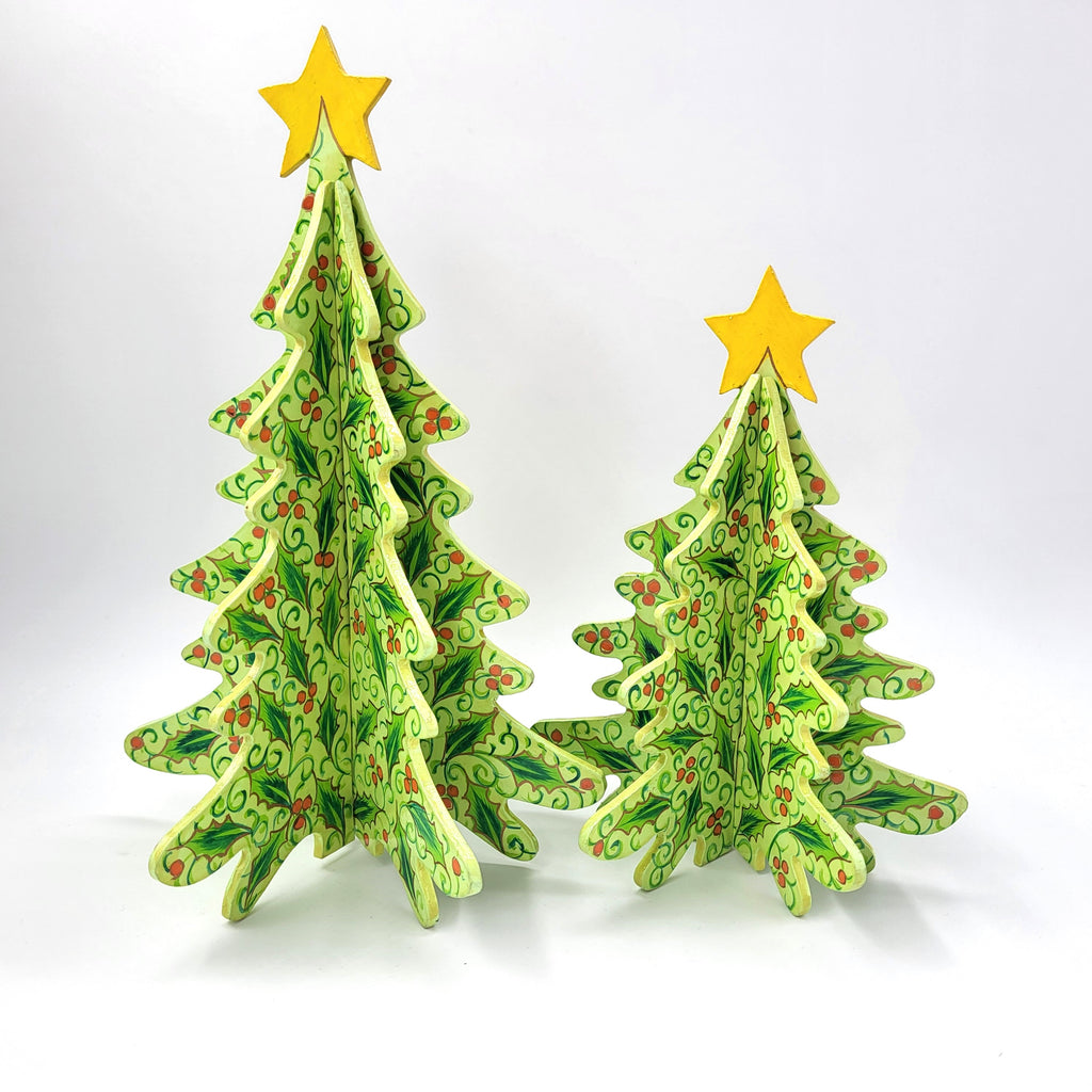 Tis the season to be jolly! These cute Christmas trees, made in papier mache and hand painted with a holly pattern, are the perfect eye-catching addition to your festive table setting. Each comes as a set of 3 pieces which slot together to create the tree, but can be flat packed for storage. Available in two sizes.